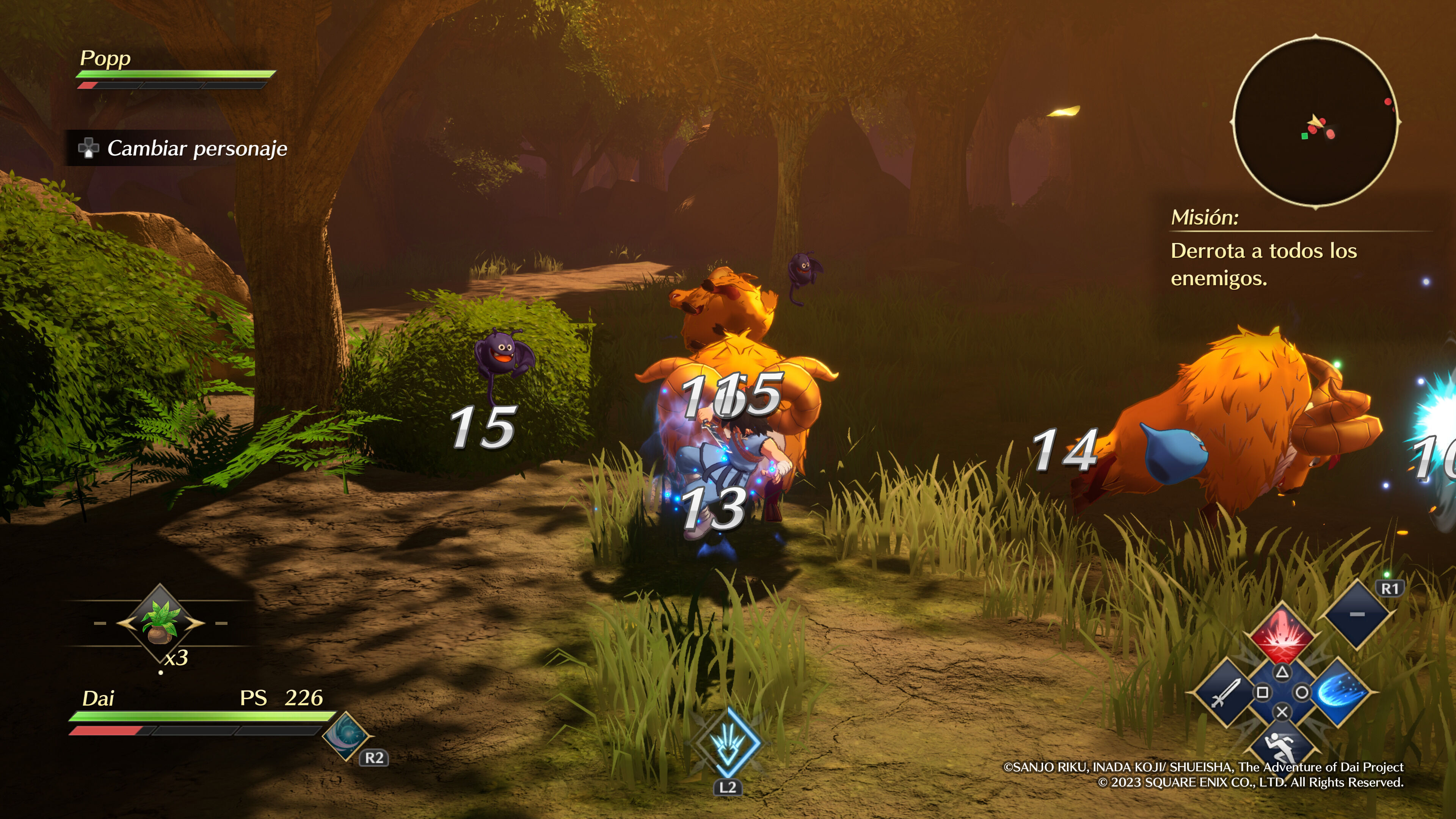 Tras las píldoras de historia llegará el momento de coger el mando y empezar a actuar con Dai, Maam, Poop y Hyunckel en las misiones de acción. Algunas consisten en breves mazmorras extremadamente lineales y sin margen para la exploración, contra puñados de enemigos en lo que parece un musou muy ligero, nada que ver con un Dragon Quest Heroes. El sistema de combate aquí no se luce para nada, lo cual da una impresión floja de Infinity Strash: combos de un botón más el remate final, uso de habilidades que se recargan por tiempo y unos movimientos de evasión o defensa -perfectas si se ejecutan en el momento preciso-.