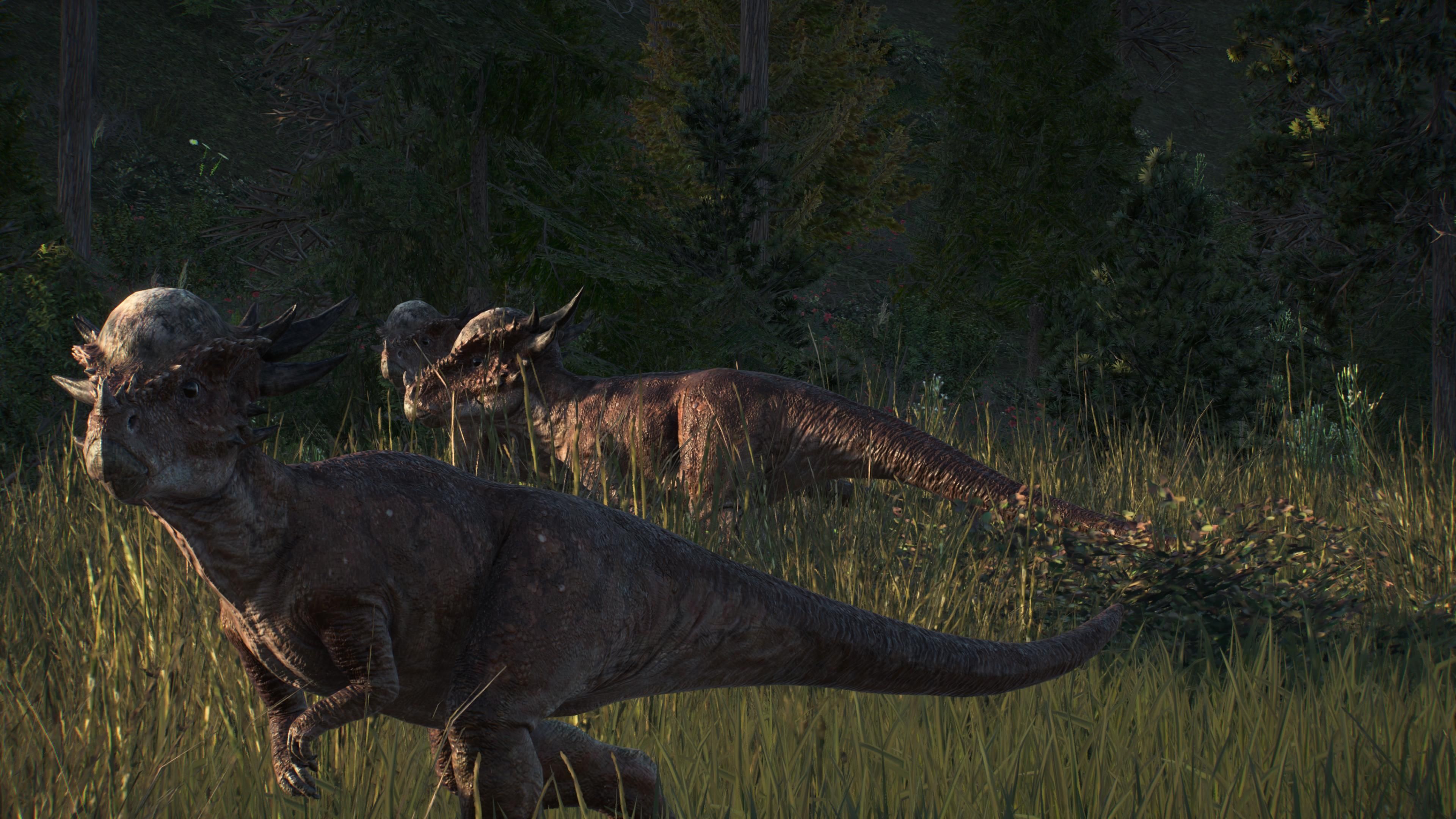 Si observamos con detenimiento, comprobaremos que hay especies que son muy territoriales y marcan lugares en su hábitat, buscando zonas que se adapten a sus comodidades y necesidades, reclamando dichas zonas como propias. En un momento, criamos varios Triceratops en un cercado con más animales. Poco a poco movieron su territorio, buscando agua, más bosque y fibra a ras de suelo, y arrinconaron a otros dinosaurios que buscaban elementos similares, dejándolos en una parte menos abundante en cuando a sustento. El sistema de comportamiento es realmente dinámico, establece una conexión muy realista entre dinosaurios, los hace sentir como verdaderos animales. Podemos pasar horas deleitándonos con sus animaciones o haciéndoles fotos de todo tipo que, más allá de algunos detalles, podrían pasar por fotogramas de las propias películas. Además, en esta ocasión Frontier ha incorporado reptiles voladores y marinos, una adición muy esperada, por lo que ya podemos alimentar con tiburones a nuestro propio Mosasaurus, estrella de la saga Jurassic World, y una de las atracciones más espectaculares de cuantas existen en el juego.