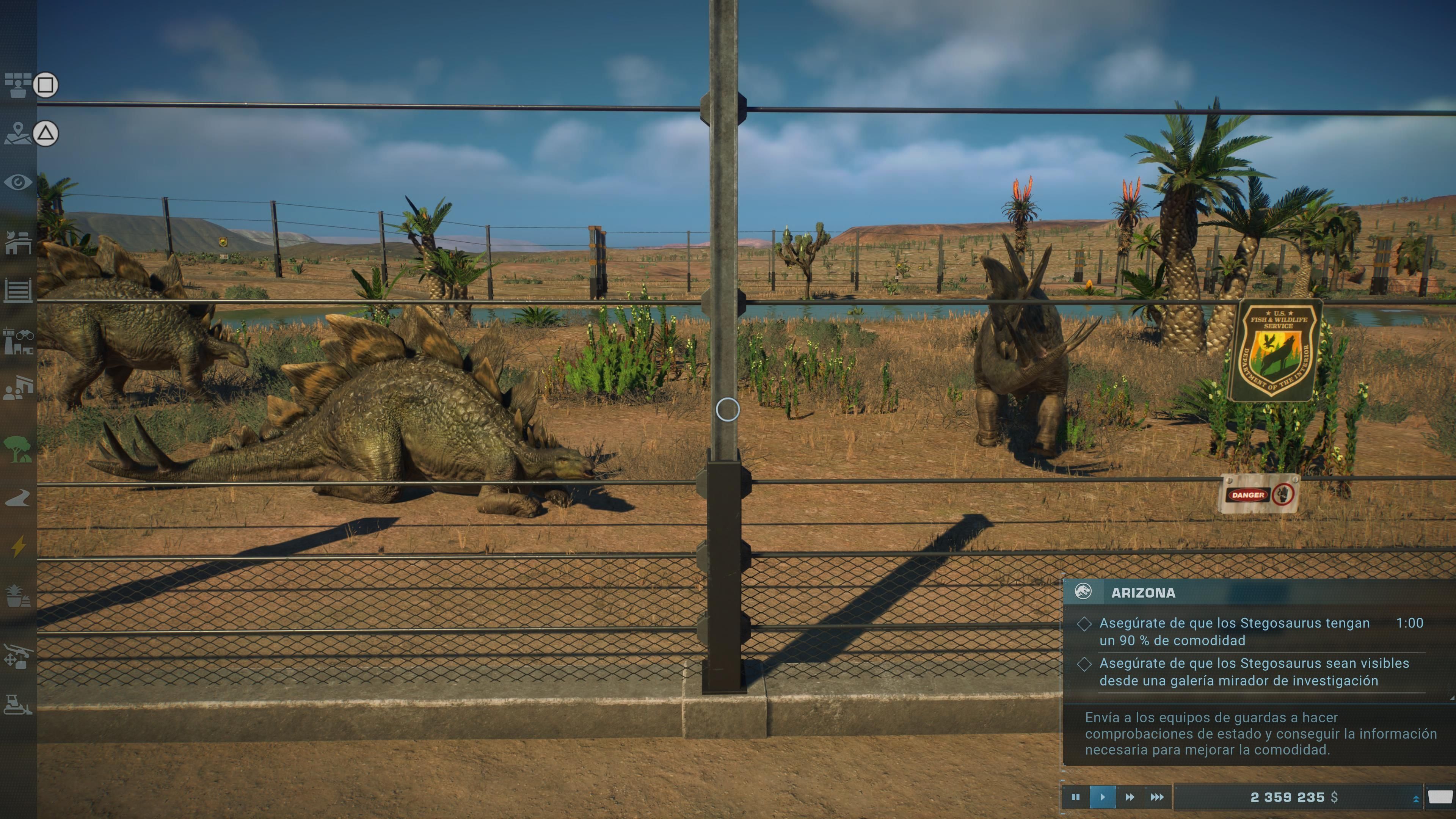 Como jugadores tendremos que superar varios escenarios temáticos a lo largo de la geografía de Estados Unidos, solucionando problemas como un aumento de la cacería furtiva en parques naturales -un grupo de cazadores ha encerrado a varios Carnotaurus de mala manera y estos se han comido a sus captores- a una serie de peligrosos patrones de migración de bandadas de Pteranodon que están interfiriendo en las rutas aéreas de las principales aerolíneas del país. Son niveles que ayudan, a modo de tutorial, a comprender las mecánicas más básicas de captura y acondicionamiento de animales, así como de los fundamentos de la gestión. En el primer nivel, enmarcado en el desierto de Arizona, aprenderemos a captar a los saurios que vagan en libertad, acondicionarlos en sus recintos y cuidarlos de la mejor manera. En un un abrir y cerrar de ojos estaremos trasladando a grupos de Stegosaurus con distintos helicópteros a través de las llanuras o abriendo lagunas para que nuestro Baryonyx devore su ración de pescado diaria.