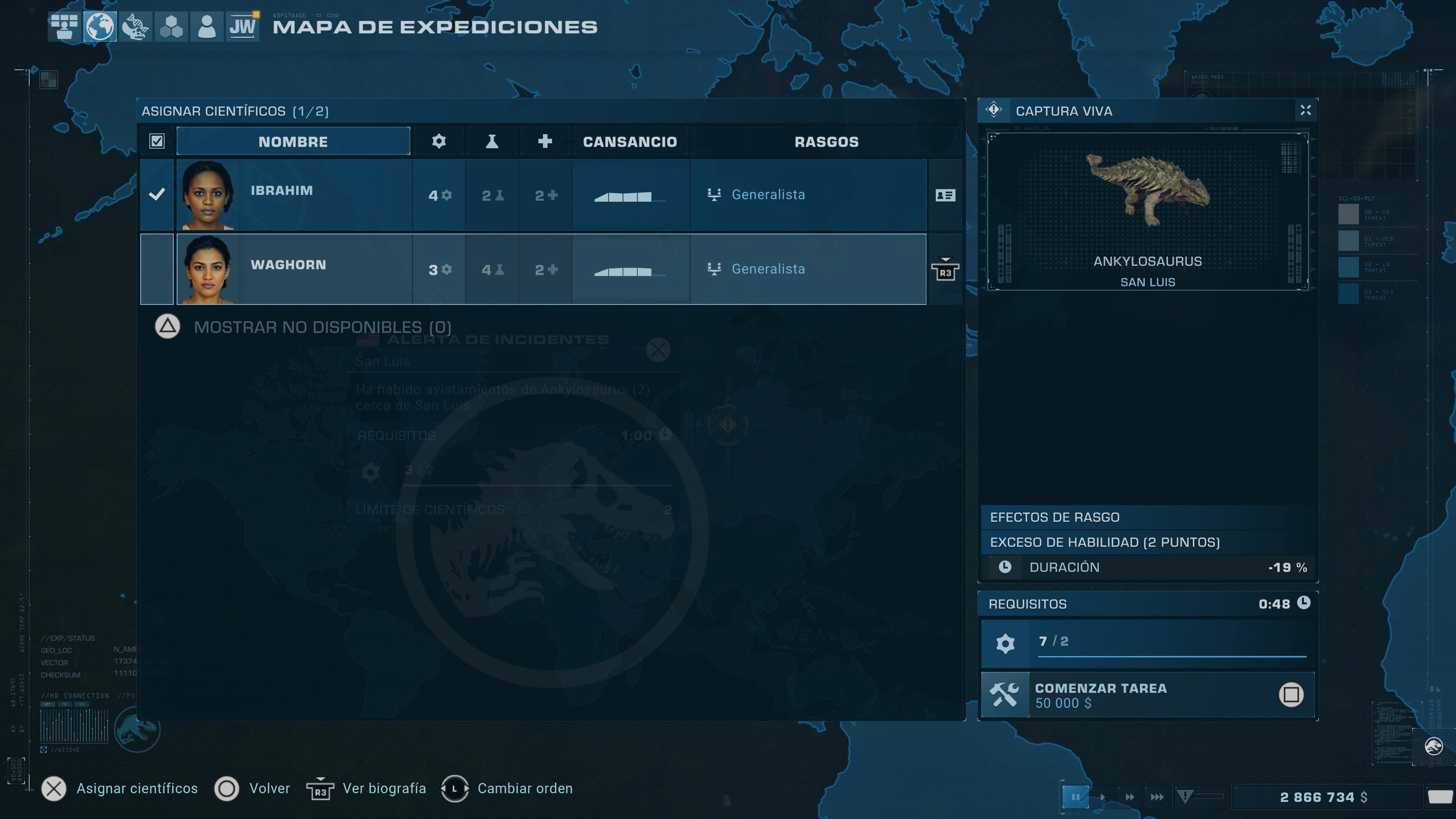 En Jurassic World Evolution 2 se ha simplificado este sistema, ofreciéndonos la posibilidad de contratar científicos y expertos en distintas ramas y facetas tecnológicas, los cuales pueden ser asignados a una gigantesca cantidad de trabajos. ¿Necesitamos atrapar un Albertosaurus que está liándola en el sur de Estados Unidos? Mandamos a un trabajador que cumpla los requisitos de la tarea. ¿Hay que desarrollar una cerca de mayor seguridad y voltaje? Pues mandamos a dos científicos que sepan de ingeniería. Encontrar el equilibrio de trabajo y rendimiento del personal es vital. Estos empleados necesitan descansar, tienen sus fortalezas y debilidades, y por si fuera poco, tienen un coste mensual variado. El sistema recuerda un poco al de otros videojuegos de gestión y nos ha parecido muy similar al de la Mother Base de Metal Gear Solid V: Phantom Pain.