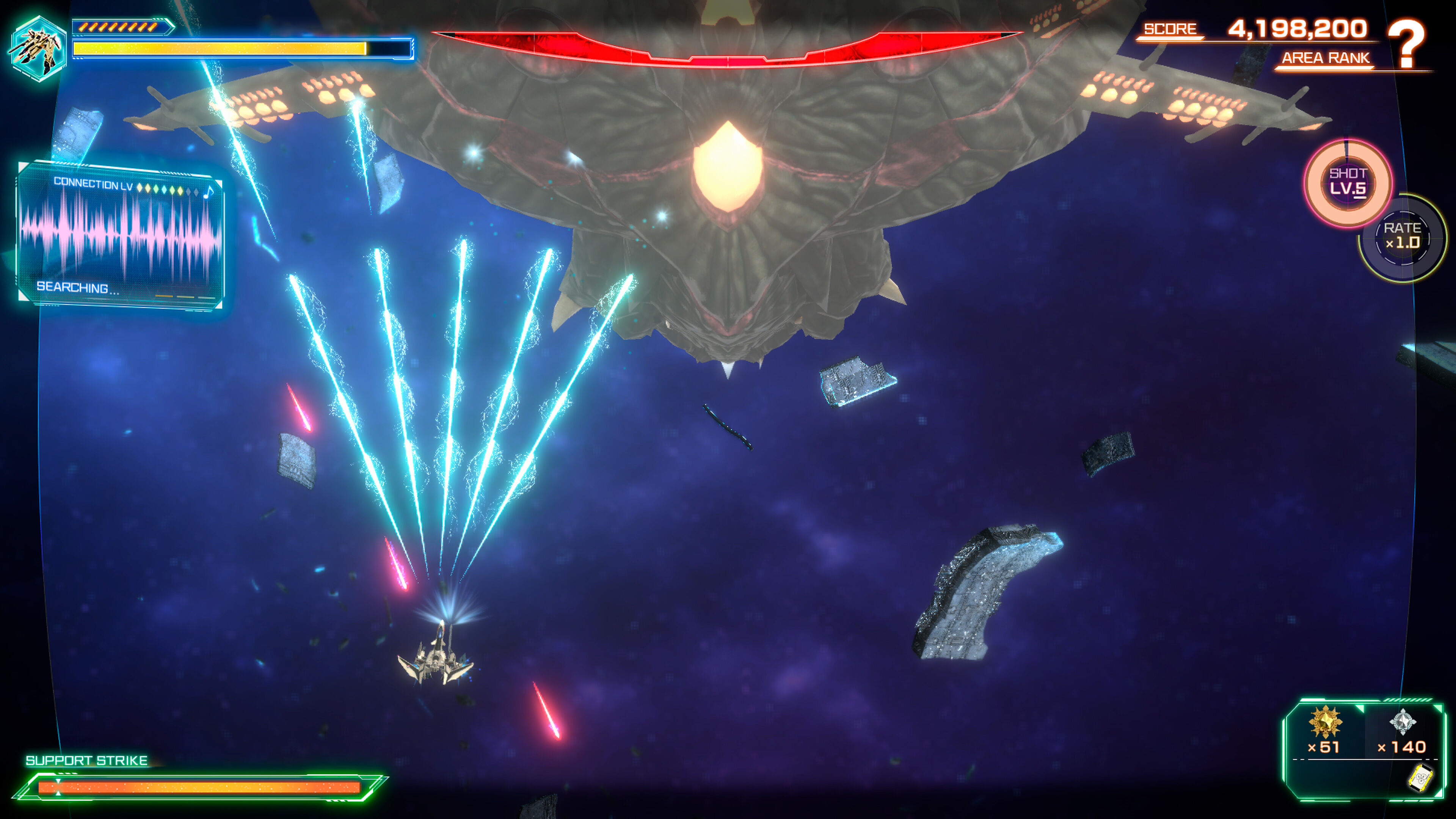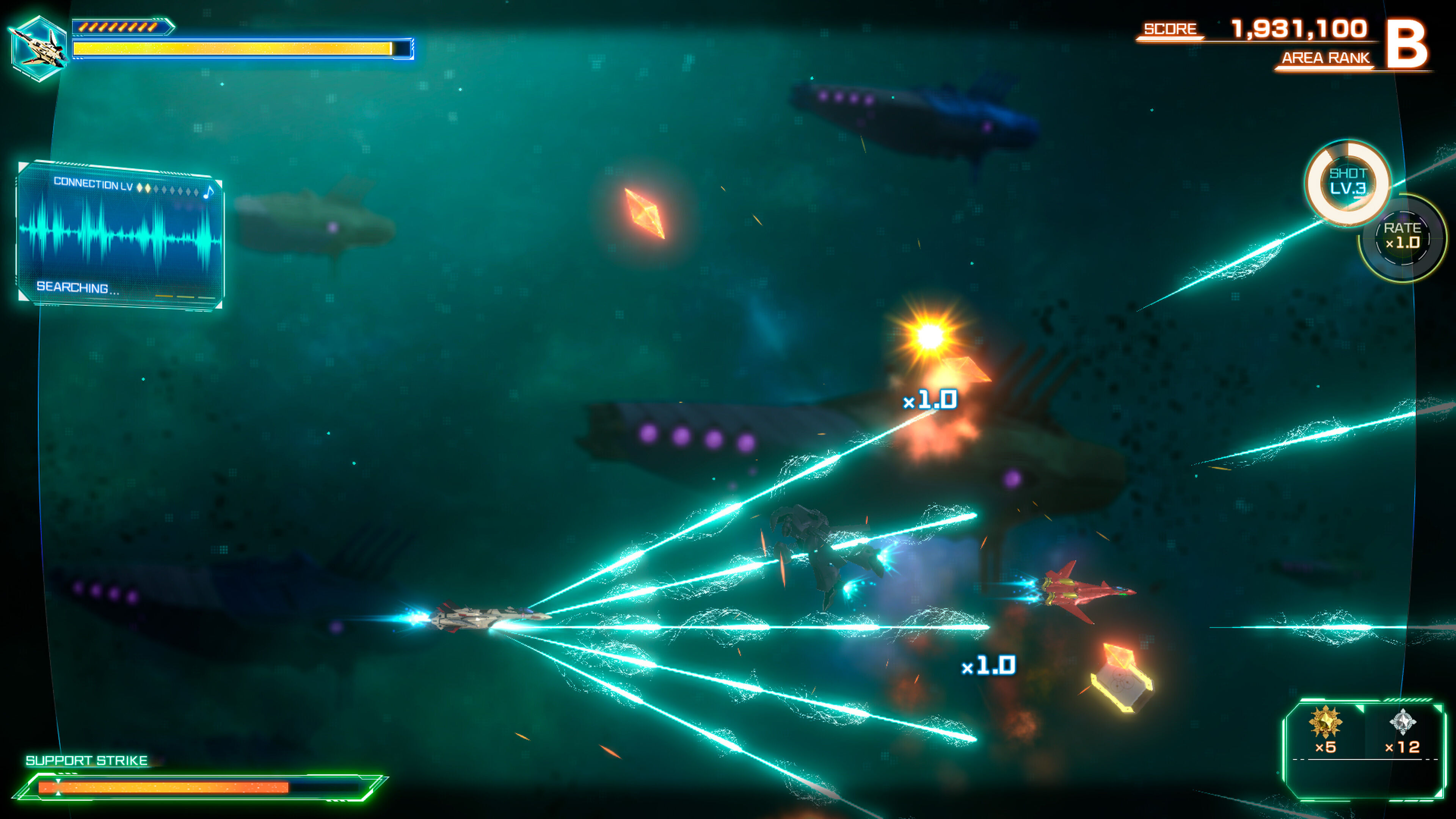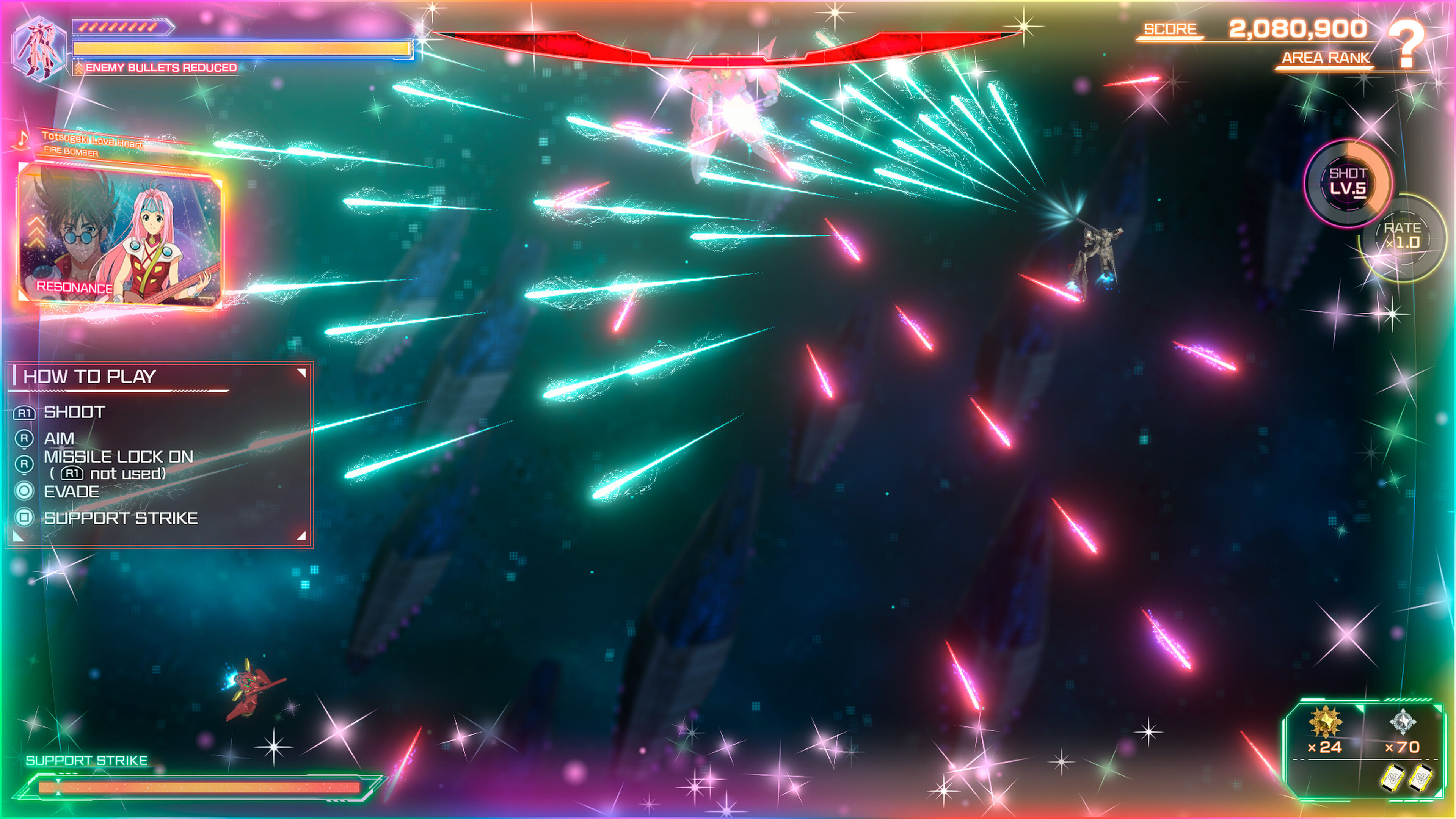En la parte positiva, podemos mencionar que hay ajustes de dificultad que lo hacen mucho más adaptable a todos los niveles de experiencia; es un género que normalmente basa su duración en un desafío alto, y en condiciones normales aquí también se penaliza con dureza -mucho, incluso-. Por suerte, hay ayudas que eliminan la subida de puntuaciones online, pero es una buena opción para tomar contacto con el juego antes de pasar a la acción en serio. Además, dispone de un modo arcade, simulaciones de enfrentamientos con otros pilotos, selector de fases y un boss rush que nos enfrenta directamente a los jefes, así como galerías para ver modelos de los cazas o fichas de los personajes. No es que nada de esto cambie mucho el tipo de juego, pero encontrarás motivos para exprimirlo durante horas.