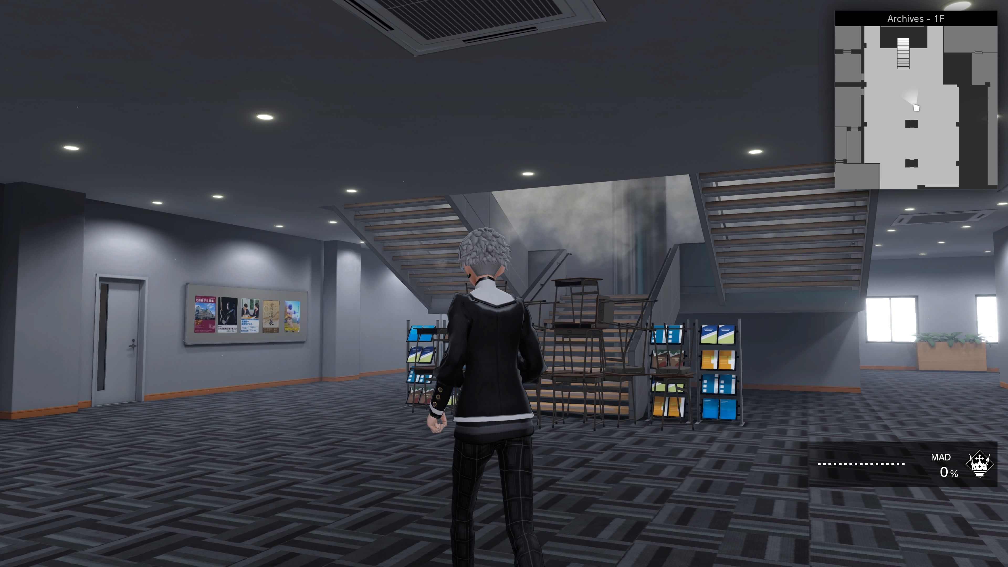 Así pues, Monark nos ofrece secciones de juego bien diferenciadas. En la escuela transcurre la historia e iremos apartando la niebla que bloquea diferentes pisos del campus. Esto supone entrar en un piso consumido por una niebla dañina para nuestros personajes –cuanto más tiempo pasamos aquí, más sube el indicador MAD, que como da a entender la palabra en inglés tiene relación con la locura y afecta a uno de los sistemas de combate-. Explorar los pasillos en este estado puede recordar a un juego de terror, con compañeros en estado catatónico y alguno que pedirá nuestra ayuda, pequeños puzles que requieren explorar el mapa, obtener información, abrir cajas fuertes, dialogar, etc. El objetivo aquí es llegar a unos teléfonos móviles que dan acceso al Otherworld y así destruir la fuente de los poderes de los Pactbearers –los personajes que han hecho pactos con uno de los Monark que corresponden con los siete pecados capitales-.