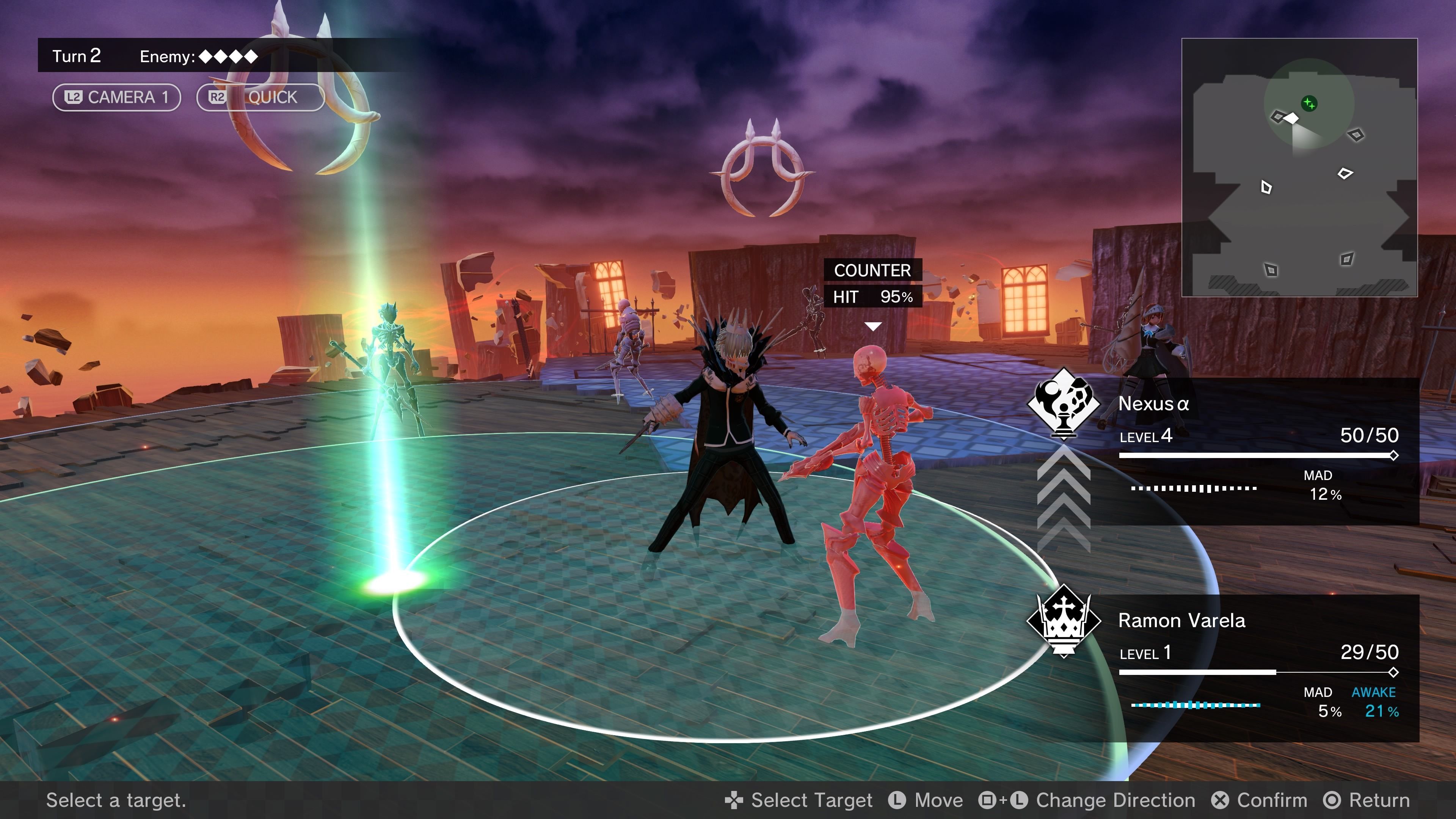 Donde Monark sí busca alejarse de la fórmula de Atlus es en sistema de batallas, que no es un tema poco importante. Sí, es por turnos, pero no es tan clásico como el de un Shin Megami Tensei sino que recoge ideas de otro juego de Lancarse, Lost Dimension, que ofrece un poco de libertad en las zonas de combate. Los personajes pueden moverse libremente dentro de un área circular y activar los comandos típicos de un JRPG, pero si por ejemplo deseas realizar un ataque físico a un enemigo fuera de tu alcance no puedes hacerlo directamente: antes hay que avanzar para que entre en nuestra área de daño. Se podría comparar con un SRPG o juego de estrategia, solo que no hay una cuadrícula que marque estas distancias.