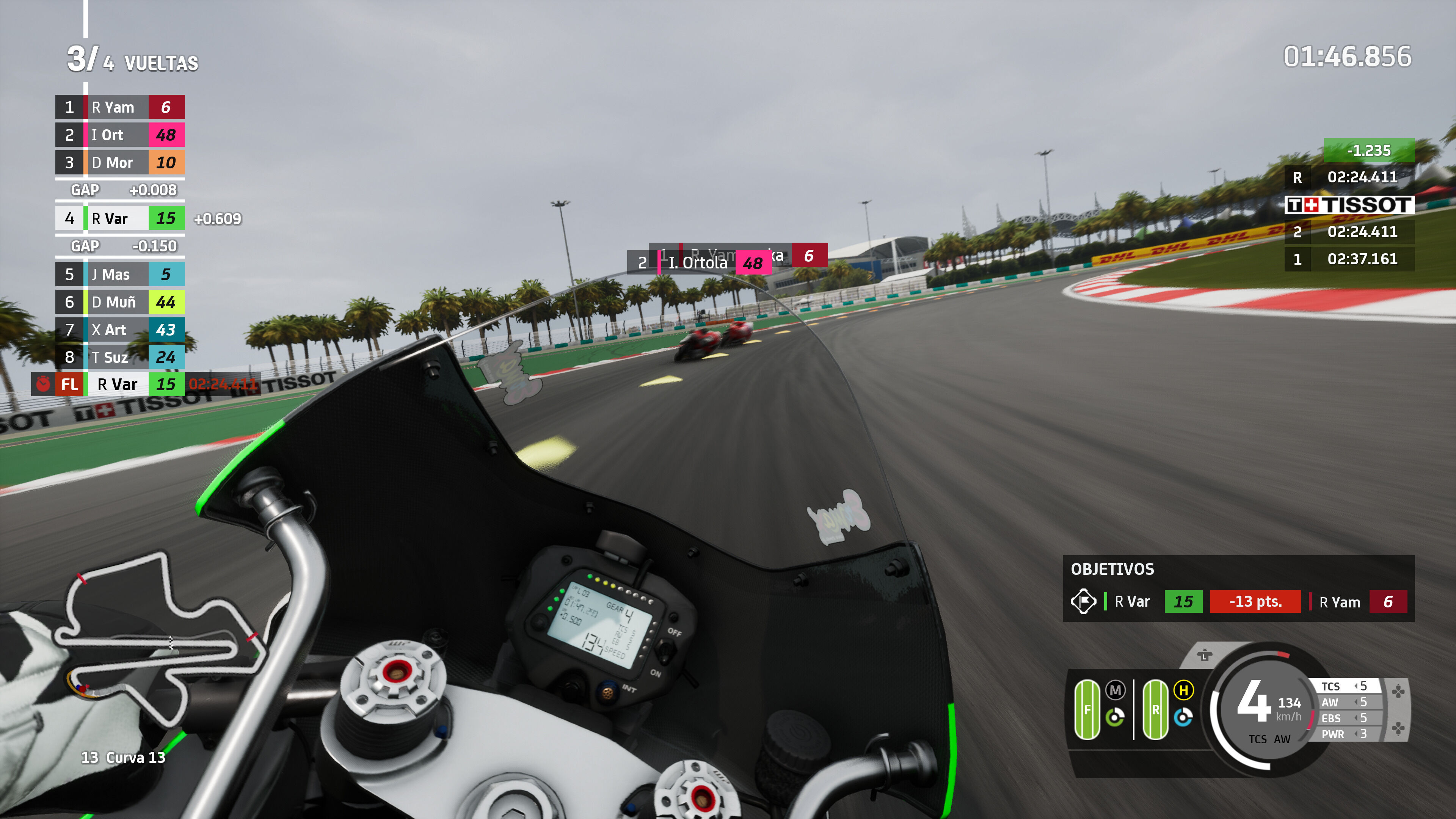 Hay que aclarar que esta es sólo una de las cuatro opciones de control disponibles. El modo debutante activa estas ayudas de IA, la transmisión semiautomática, electrónica asistida y la posibilidad de rebobinar el tiempo, o incluso ajustar cada ayuda a nuestro gusto. Podrías empezar a competir con la asistencia al máximo e ir eliminando opciones según ganas confianza. A fin de cuentas, los mejores tiempos los vas a conseguir con el dominio total de la moto, cuando arriesgas; el modo debutante no te da margen para mejorar como jugador así que más pronto que tarde lo dejarás atrás.