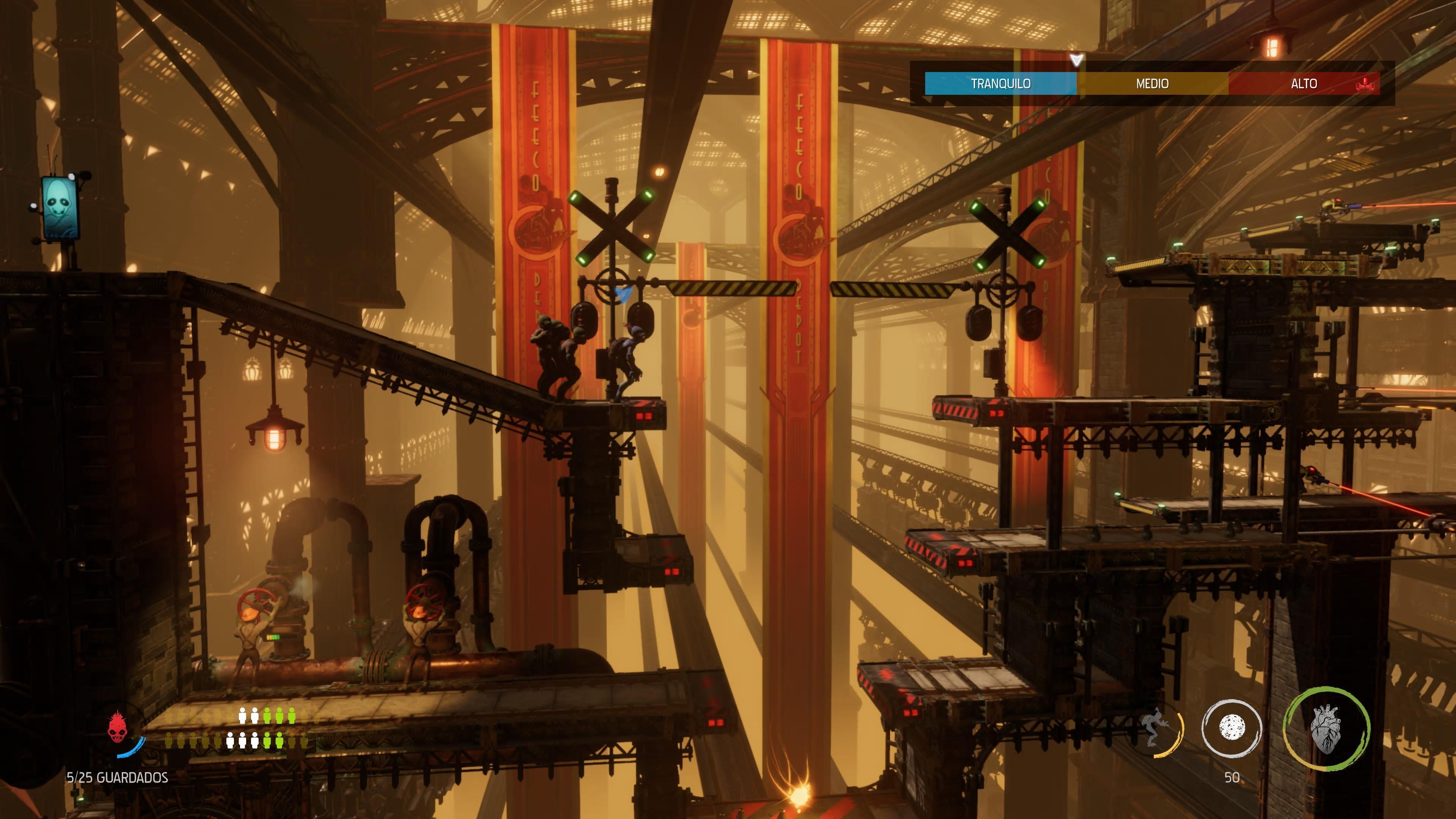 Cambiando un poco de tercio, cabe destacar que se trata de un juego bastante largo y rejugable. Nosotros hemos tardado unas 20 horas en ver su verdadero final, pero también hay un selector de fases para que podamos reintentar los niveles todo lo que queramos, afrontar sus retos opcionales, mejorar nuestras marcas y salvar o condenar a los Mudokons que nos hayamos dejado, por lo que no va precisamente falto de contenidos.