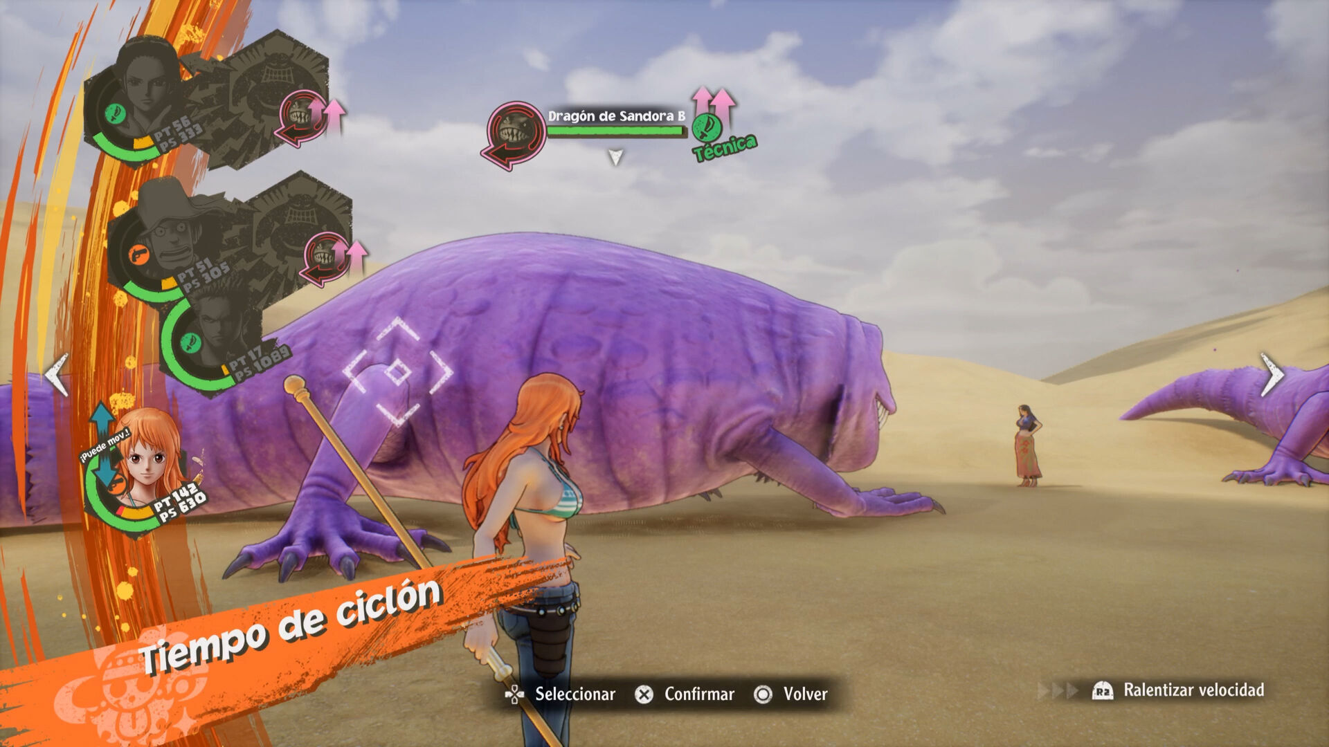 Sin embargo, todo esto cae en saco roto muy pronto por la ausencia total de dificultad, salvo un pico considerable en la etapa final, a la que más vale ir bien pertrechados. Lo que al principio es un sistema de combate ágil que augura grandes momentos de darle uso a la materia gris acaba dando lugar a enfrentamientos repetitivos. Los enemigos son variados en su diseño, pero no en su comportamiento en batalla, y tampoco se deja de lado el ofrecer versiones más poderosas de las mismas con otros colores; incluso se atreve a repetir jefes finales, que tampoco ofrecen reto alguno. Además, en esa repetitividad influye la representación de las técnicas en pantalla. Son espectaculares, pero la decimocuarta vez que has visto a Sanji hacer la Patada flambeada, lo mismo cansa. El juego es consciente de esto y permite mostrar los combates a más velocidad, pero habríamos agradecido la posibilidad de omitir esas escenas.