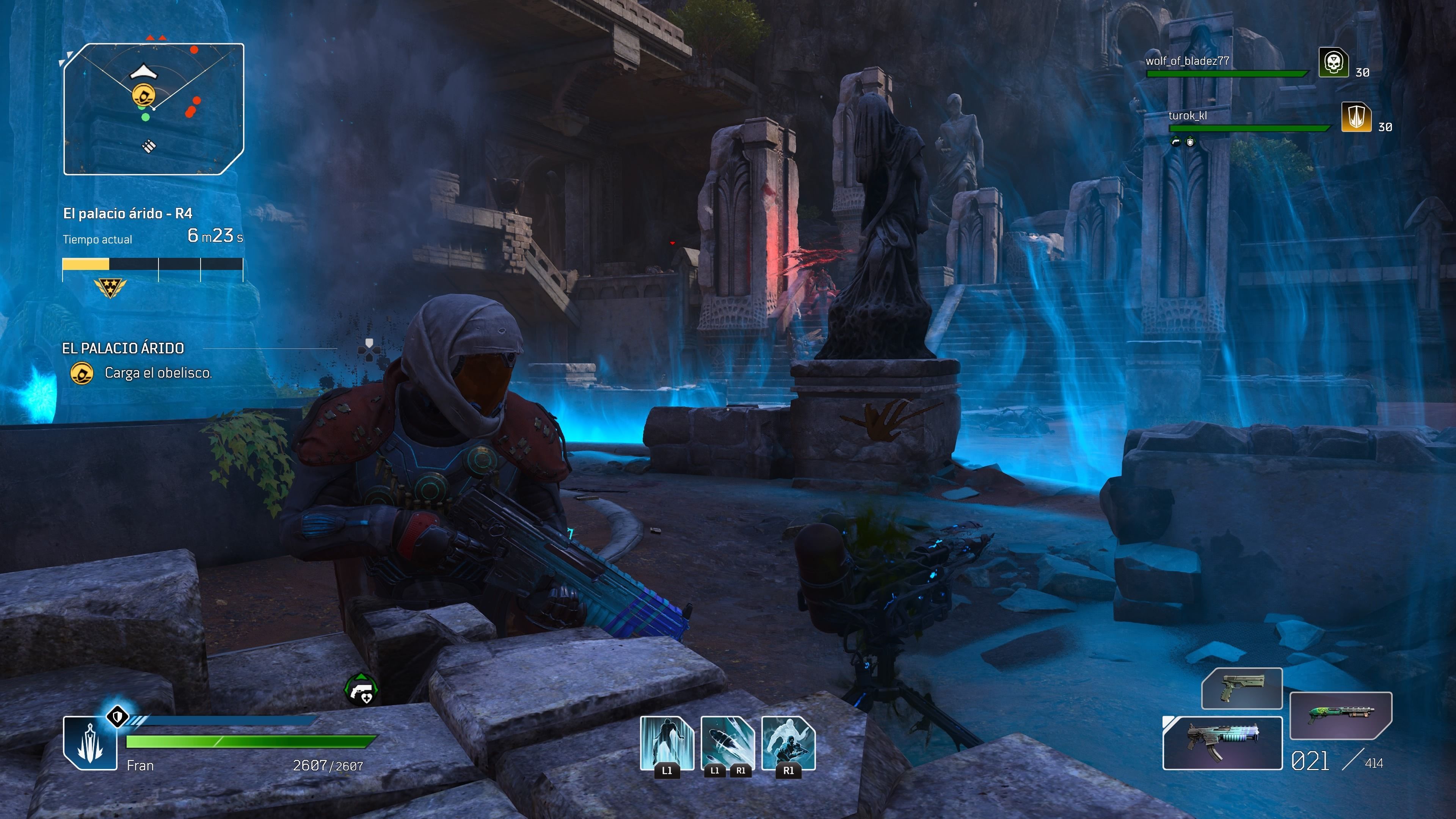 Por ejemplo, el Tecnomante se cura todo el daño que haga él o las torretas que pone, el Piromante se cura al matar a los enemigos marcados con sus habilidades de fuego y la que nosotros hemos elegido, el Ilusionista, se cura al matar enemigos a corta distancia y se cura más cuantos más adversarios haya cerca. Hay que tener muy en cuenta esta mecánica porque el juego no nos deja dormirnos en los laureles, ya que la vida baja constantemente porque los enemigos no paran de tirarnos granadas, lanzarnos magias, etc.