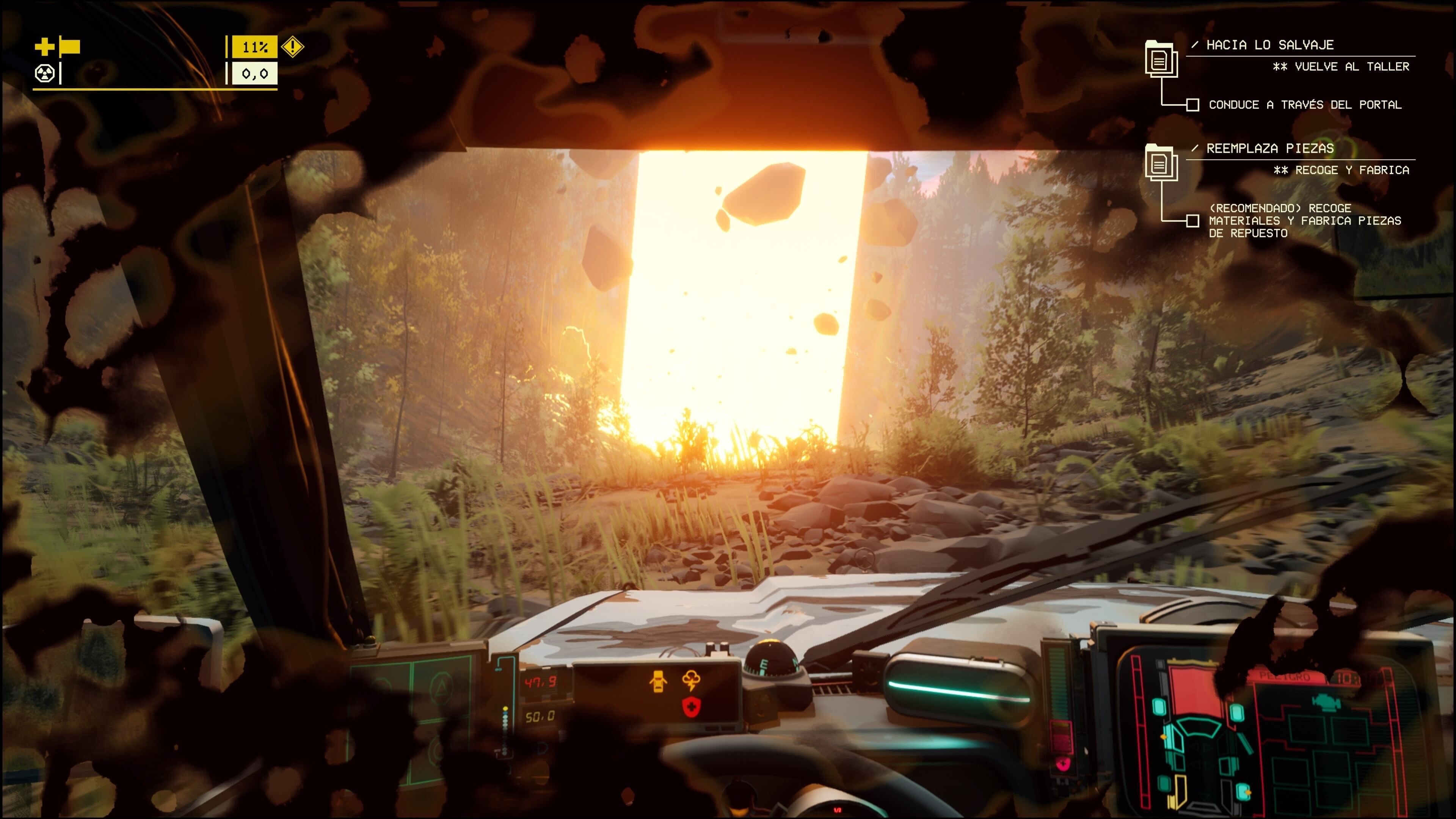 Planteado este inicio, el juego se estructura en un constante ciclo de viaje y preparación. Cuando vamos dentro del coche este se convierte en una extensión de nosotros mismos, así como un escudo que nos protegerá de las anomalías que pululan por la zona. Esto significa que tendremos que pertrechar bien el vehículo, intercambiando piezas por otras más fuertes y reparando las que se hayan averiado en el camino.