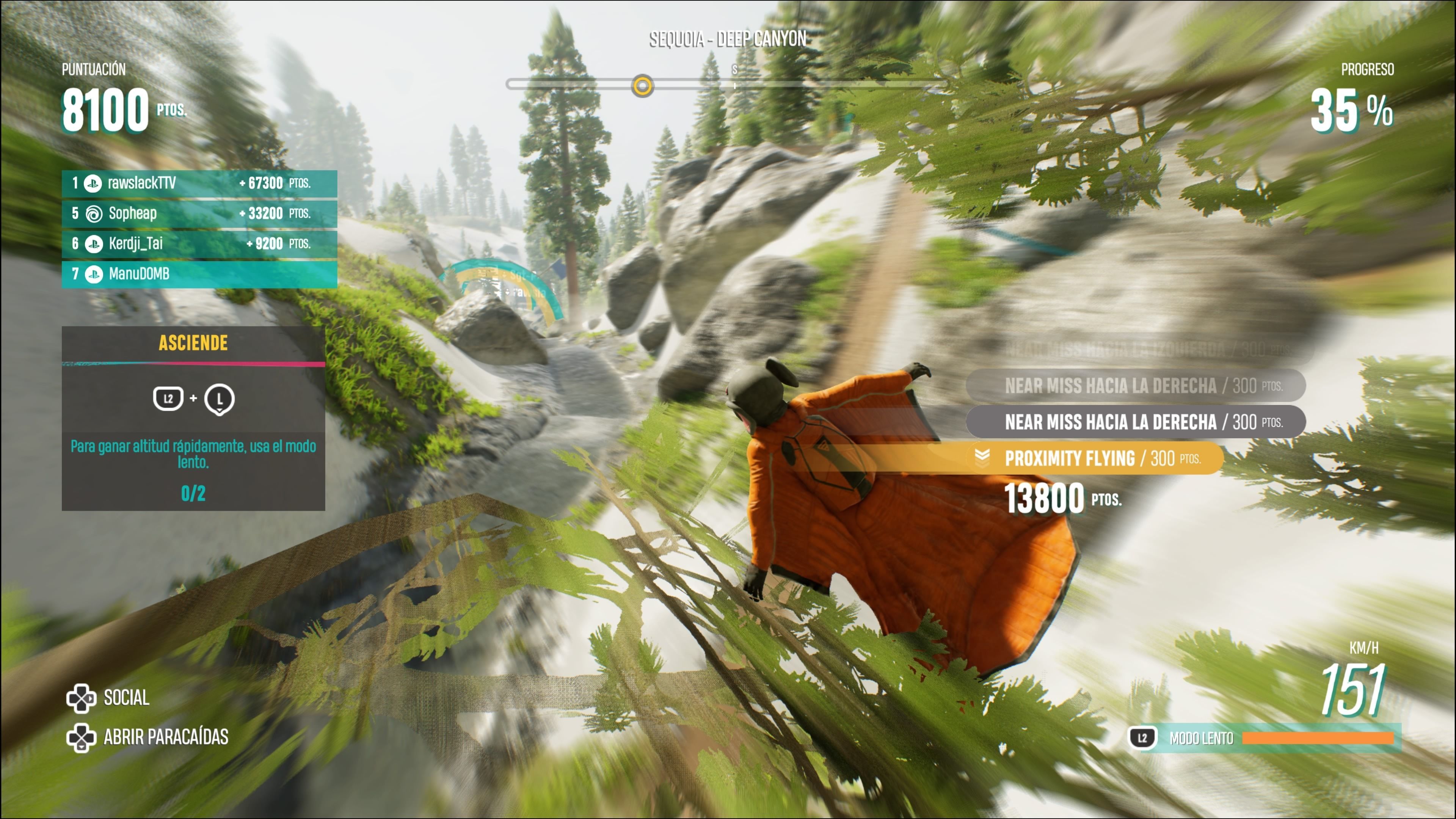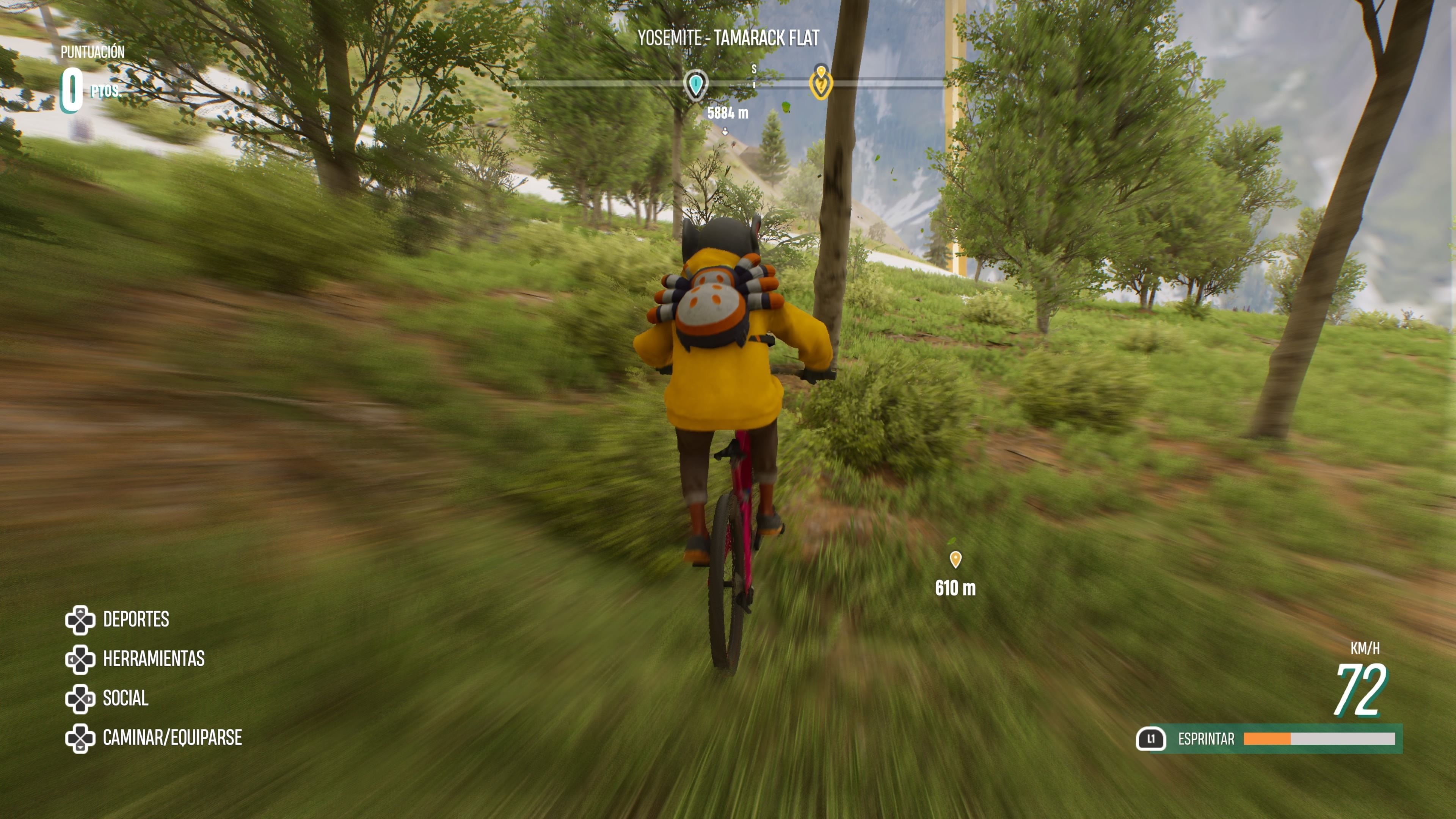 Riders Republic apuesta por el flow constante en lugar de por penalizar fuertemente el fallo. Si nos caemos o nos chocamos tenemos dos opciones, rebobinar o incorporarnos inmediatamente, y ambas son tan permisivas que en muchas ocasiones ese error incluso nos puede suponer una ventaja: el cuerpo del avatar mantiene la inercia cuando chocamos y cuando reaparecemos lo hacemos montados ya en la bici o los esquís, por ejemplo, lo que nos permite aprovechar esa velocidad para no perder tiempo en la carrera. También es muestra de esta intencionalidad que podamos cambiar de deporte en cualquier momento, lo que favorece combos tan locos como ir volando con el jetpack hasta una colina nevada, cambiar por la tabla de snowboard, caer por la ladera hasta saltar y en el aire cambiar por la bicicleta para seguir descendiendo por la carretera.