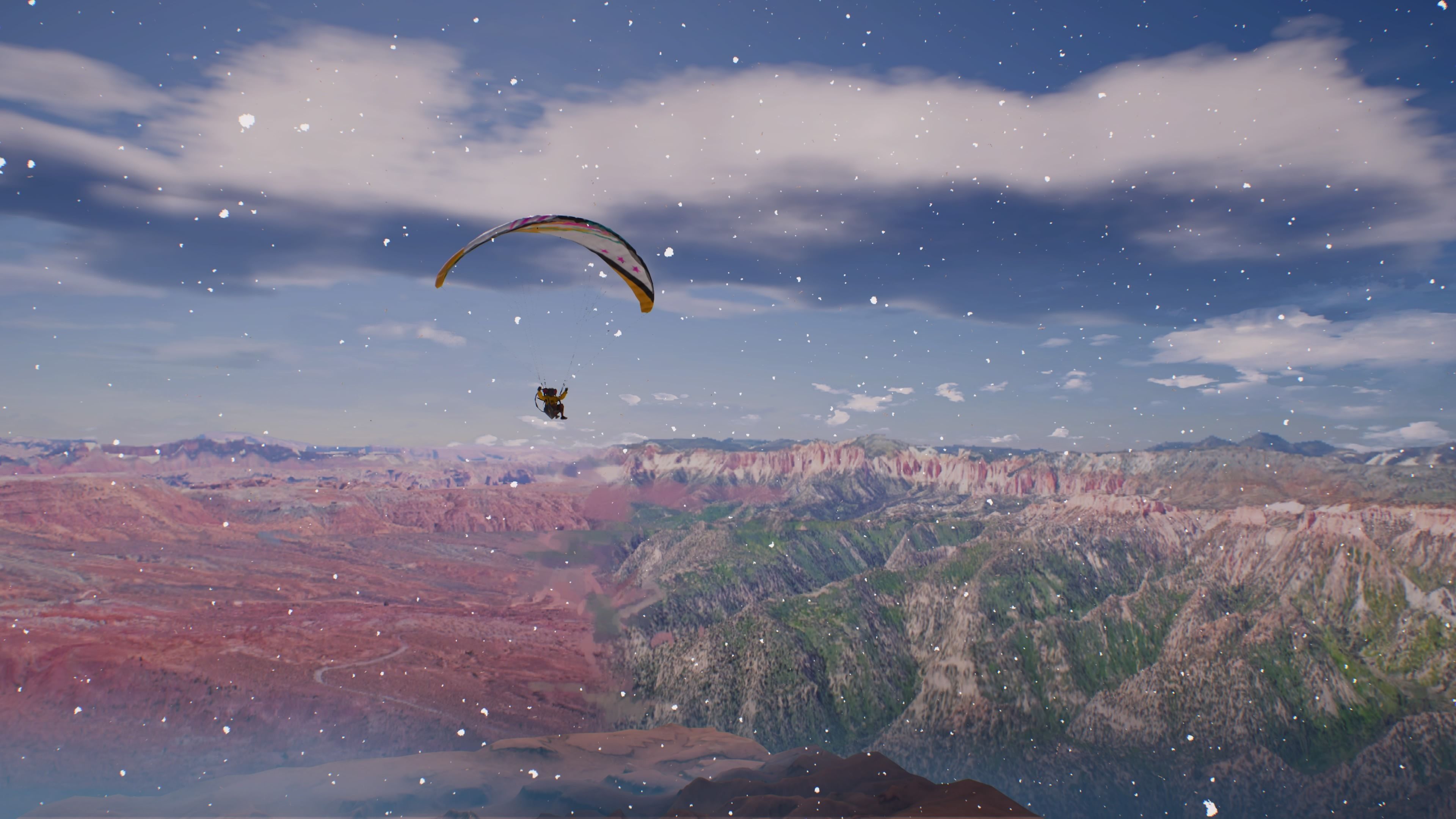 El propio escenario también favorece ese tipo de cadenas de cambio, no sólo por el propio diseño del terreno, con una enorme cantidad de promontorios que podemos utilizar para saltar, sino también por cómo se encajan los diferentes biomas: es fácil pasar de la nieve al bosque, de la bosque a la carretera y de esta a la zona de cañones. Casi nada de esto tiene efecto, eso sí: las características del terreno tienen poco impacto en las físicas de nuestro personaje y podemos tanto ir en bicicleta por la espesa nieve como esquiar por el asfalto; es cierto que la velocidad va a ser un poco menor y lo óptimo es utilizar el deporte adecuado para cada terreno, pero la realidad es que es posible hacer este tipo de cosas, lo que crea imágenes algo confusas que dañan la sensación de inmersión.