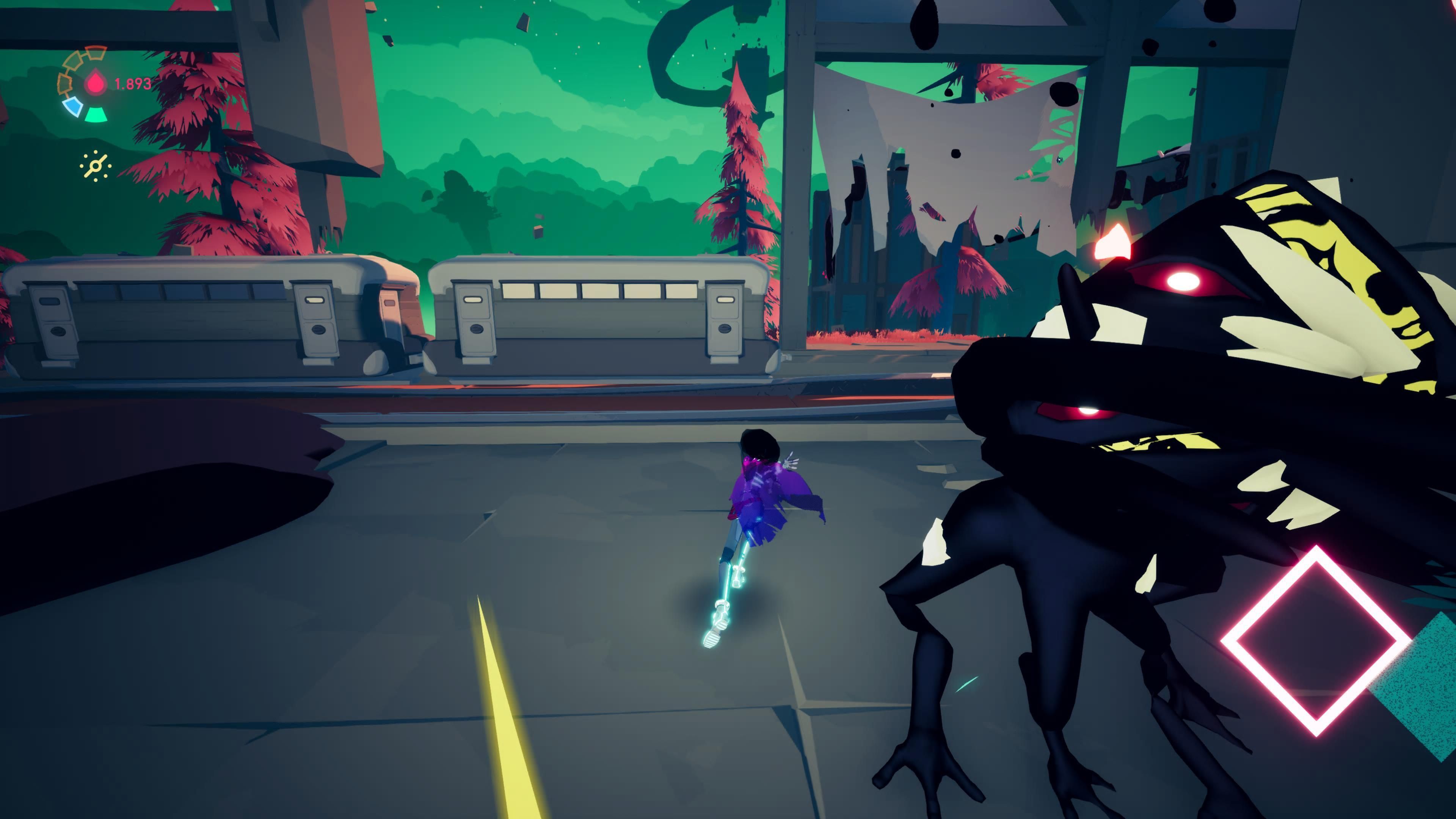 Centrándonos ya en lo puramente jugable, lo primero que llama la atención es la peculiar manera en la que Rei se mueve, ya que en vez de correr lo que haremos será "patinar" por las extrañas superficies del Ultravacío. Esto, sumado a la posibilidad de impulsarnos para aumentar nuestra velocidad, crea una dinámica de desplazamiento tremendamente satisfactoria, divertida y elegante que consigue que nos lo pasemos bien con el simple hecho de ir a un sitio a otro. Evidentemente, también contaremos con más acciones como "grindar" por raíles y sitios similares, escalar por una sustancia oscura, el imprescindible salto o una maniobra con la que podemos ralentizar el tiempo para teletransportarnos hasta los puntos de anclaje que lo permitan. Y sí, tampoco os van a faltar paredes por las que moveros cuando la gravedad lo permita.