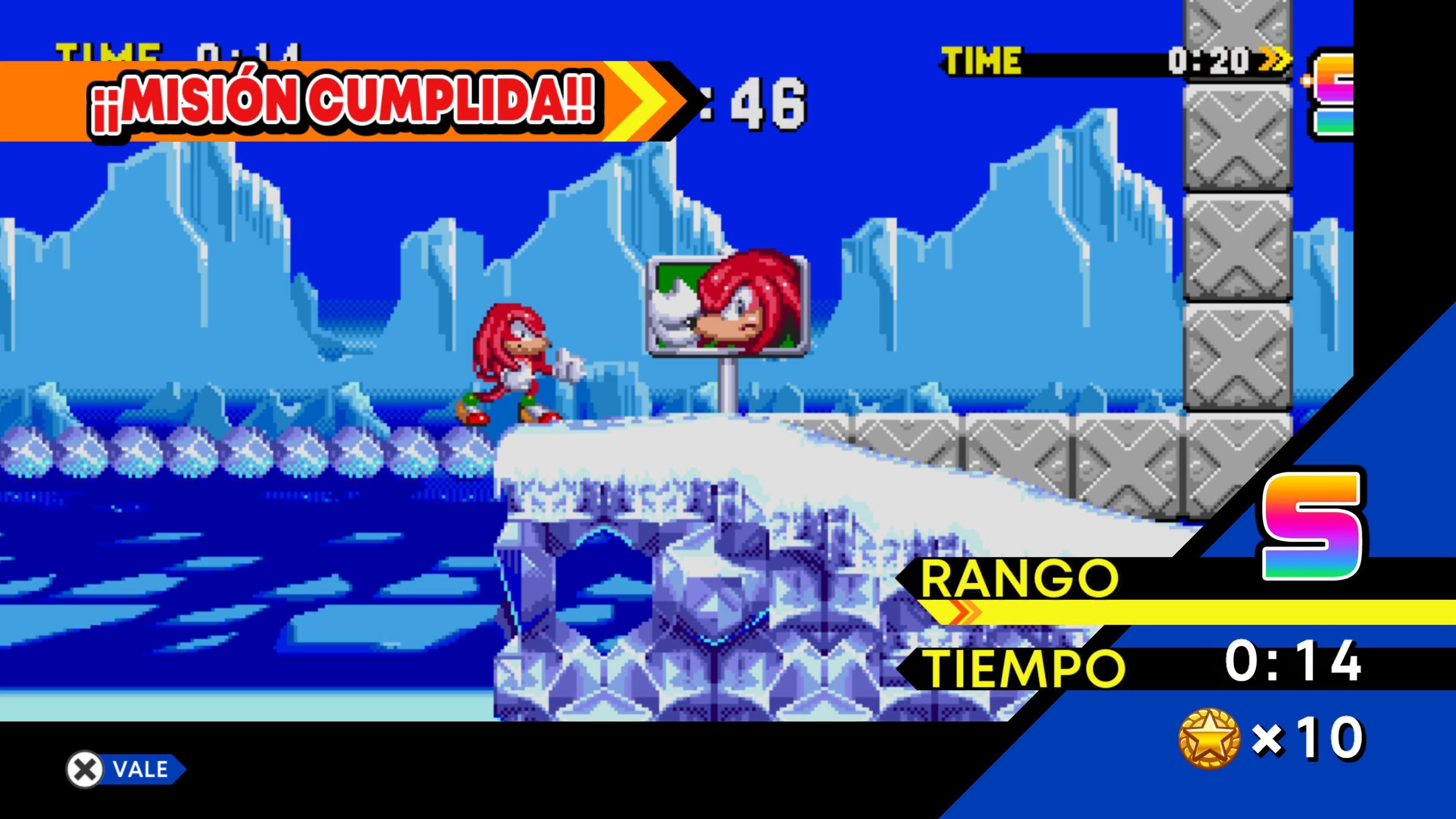 Por otra parte, ahora contamos con un Modo Misiones que nos plantea superar una serie de retos (llega a la meta con un determinado número de anillos, supera un nivel con enemigos que se mueven al doble de su velocidad normal, etcétera) intentando obtener el mejor rango que podamos. Estos duran un suspiro y la mayoría de ellos nos han parecido muy sencillos, por lo que no tardaréis ni dos horas en obtener la máxima puntuación en todos ellos a poco que tengáis experiencia con estos clásicos. Eso sí, son muy entretenidos y divertidos, y hay alguno que otro lo suficientemente desafiante como para conseguir que nos piquemos con ellos.