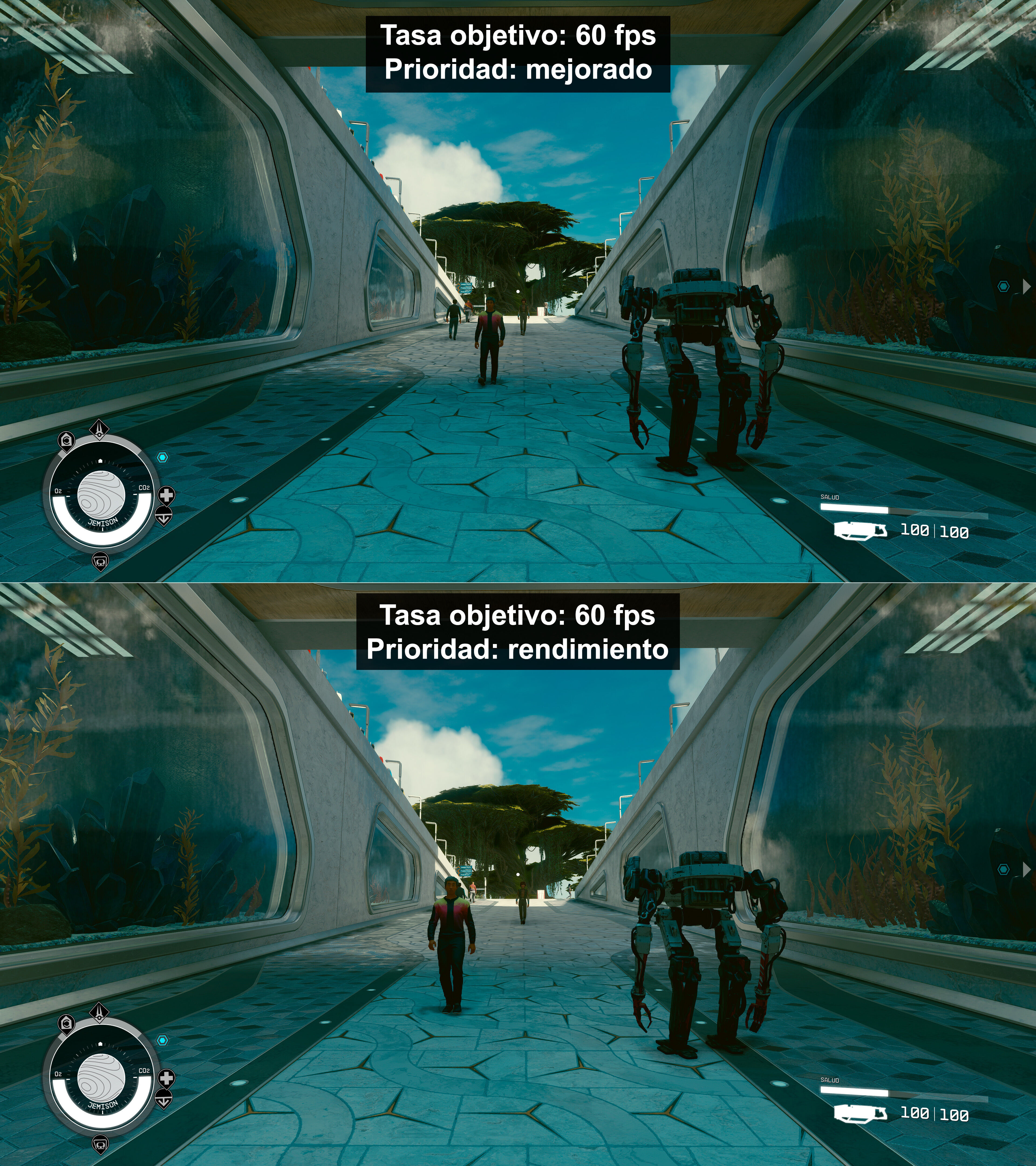 Además tenemos el ajuste de prioridad, que da más importancia al rendimiento o la calidad. En rendimiento baja la resolución interna y otros efectos, como el número de personajes en pantalla o la iluminación, y se recomienda para 60 fps o más. El modo gráfico sube la resolución y el detalle, pero en este caso Starfield no lo aconseja para 60 fps o más. A esto se suma Mejorado -que utiliza PSSR, actualizado recientemente-, un modo para aprovechar PS5 Pro con la resolución más alta que conserva los efectos a más calidad; tampoco lo recomiendan para 60 fps o más, aunque no bloquea la selección.