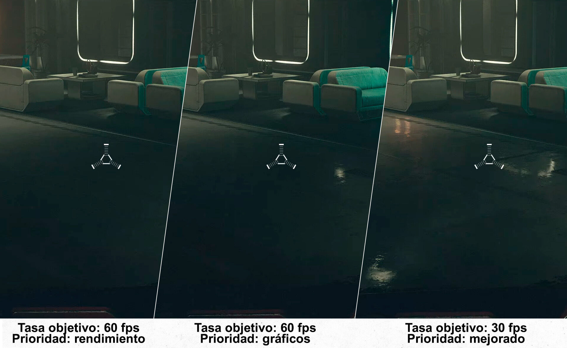 Por una parte, tenemos las tasas de fotogramas objetivos de 30 fps, 40 fps -en pantallas VRR-, 60 fps o sin límite -VRR-, que desbloquea el framerate según la carga en pantalla. El juego avisa que es aconsejable disponer de una pantalla con frecuencia de actualización variable para eliminar el tearing o cortes en la imagen cuando se seleccionan 60 fps o más.