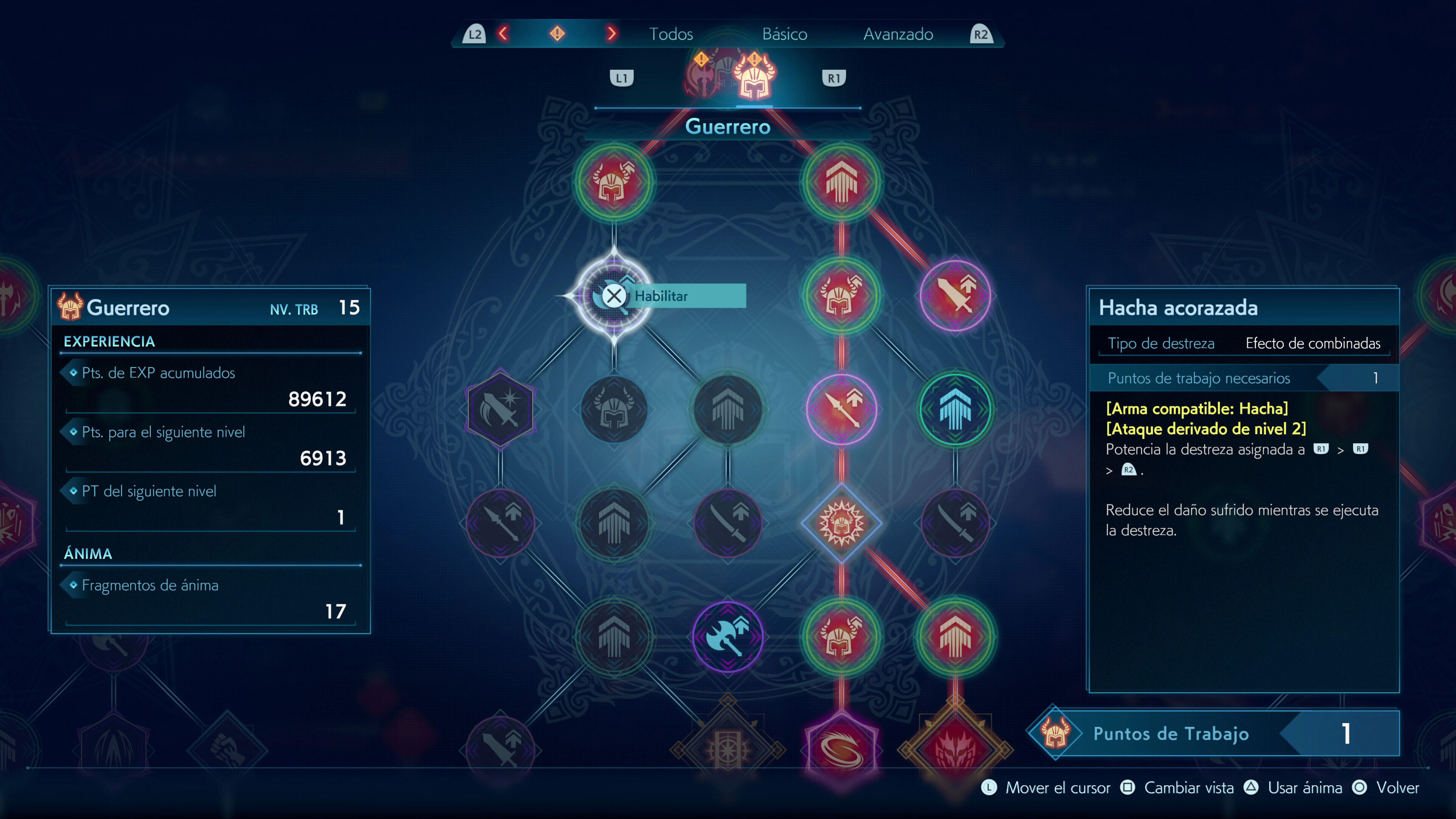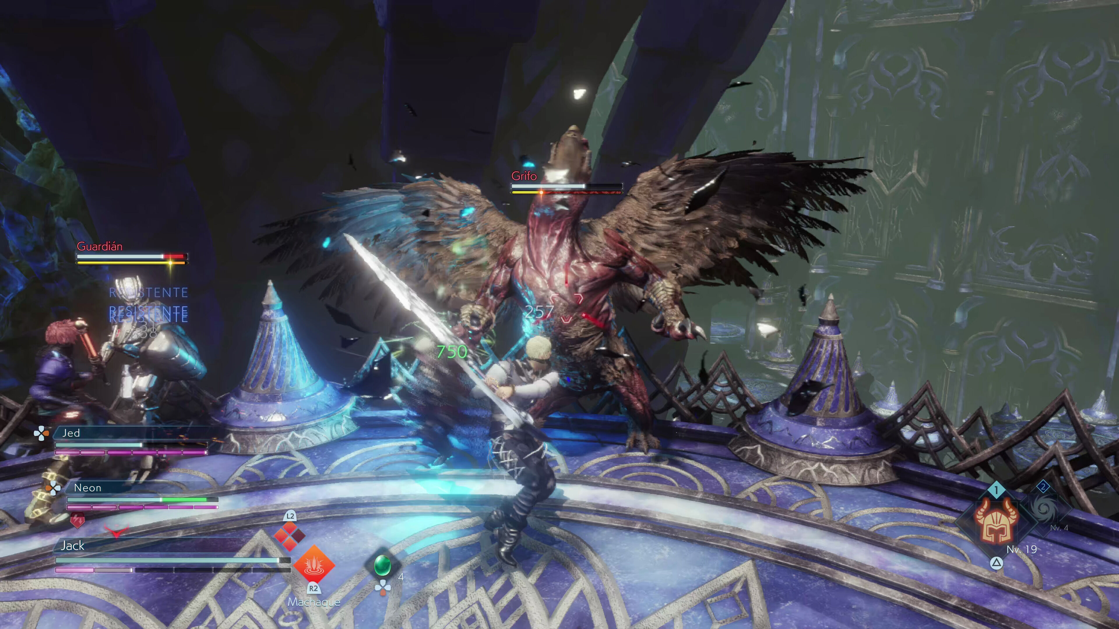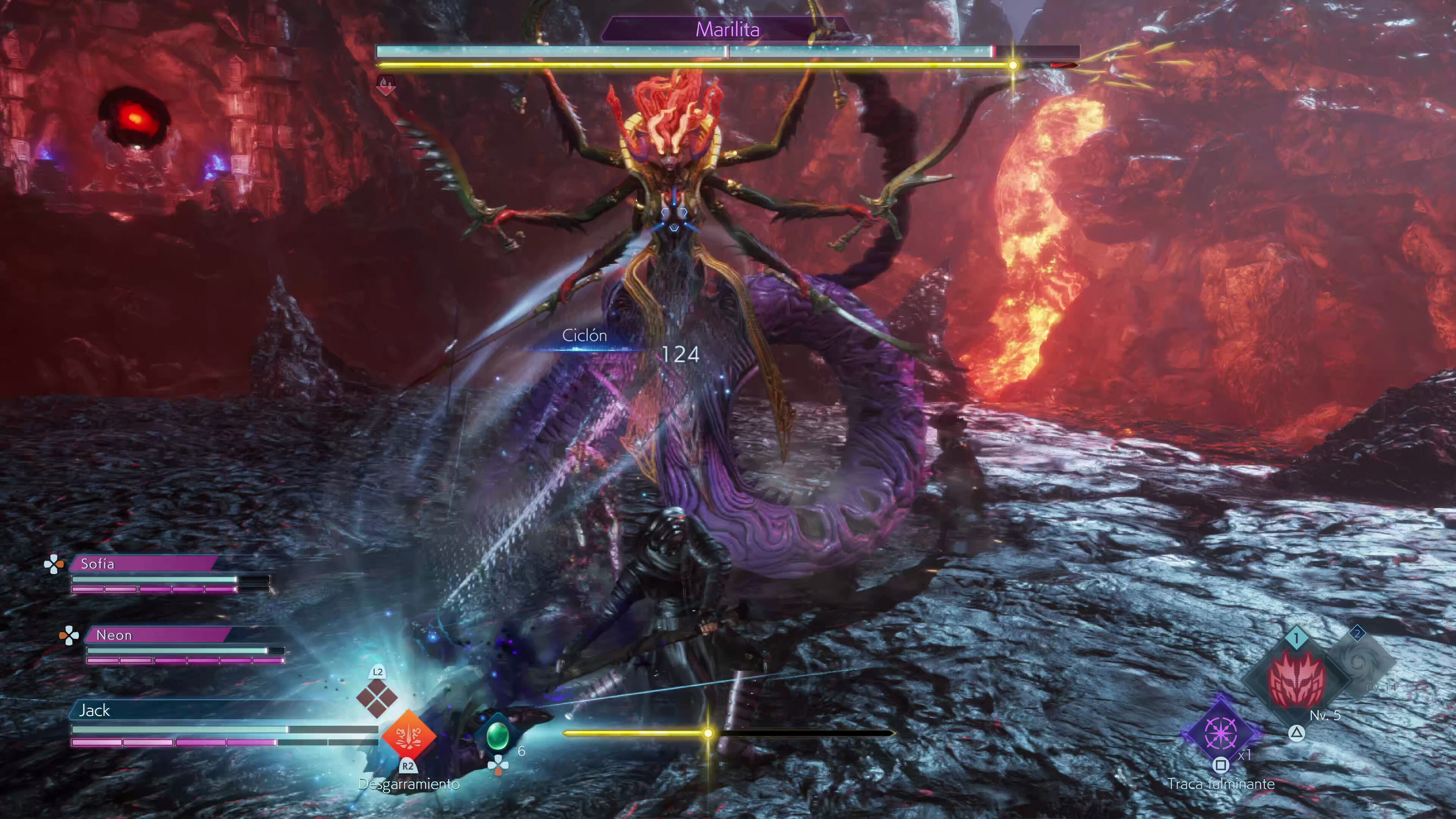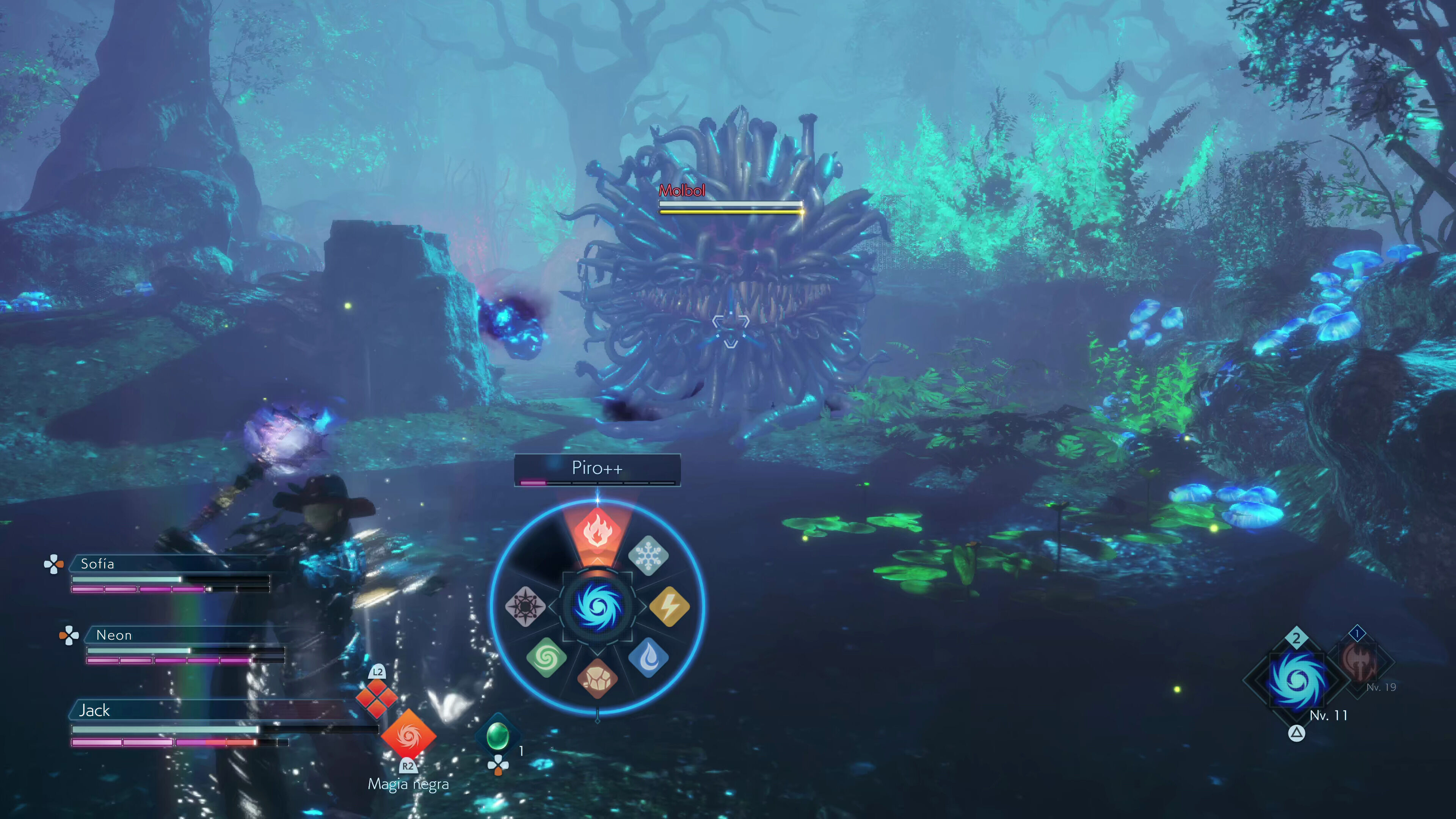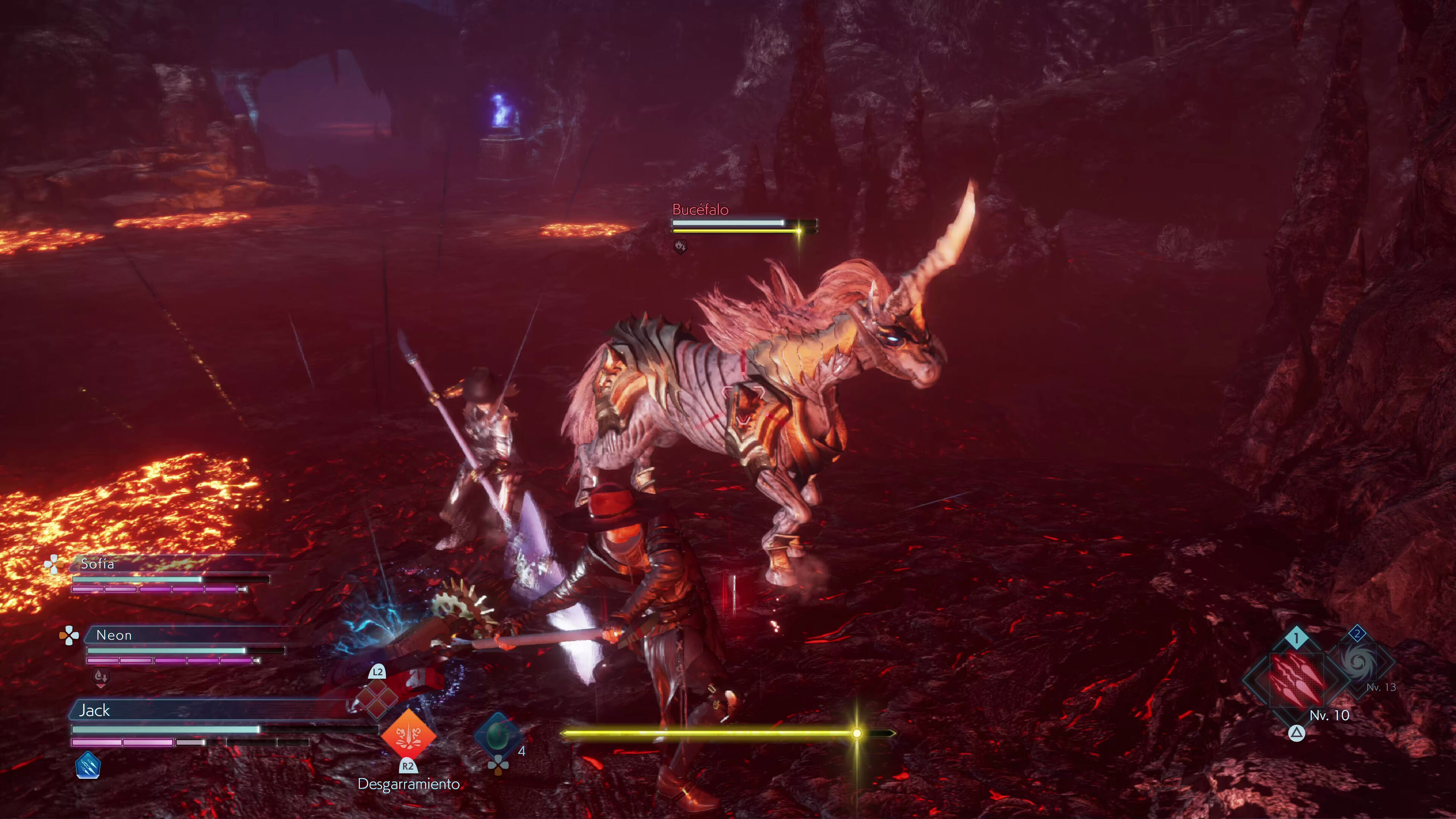 El primero está dividido en varias porciones que podremos consumir para lanzar hechizos o realizar las técnicas especiales de nuestras armas, por lo que se trata de un recurso fundamental si queremos poner en práctica nuestros movimientos más dañinos. Lo interesante es que podemos aumentar nuestro límite de puntos de magia realizando ejecuciones y paradas perfectas con Corazánima, un movimiento de bloqueo que también nos permite "copiar" algunos de los poderes de los enemigos para usarlos contra ellos como si fuesen objetos consumibles. Sumadle que también podemos recuperar maná a base de golpes básicos y entenderéis rápidamente la importancia de mantenernos a la ofensiva y aprendernos bien los patrones enemigos para cuadrar bien los parries.