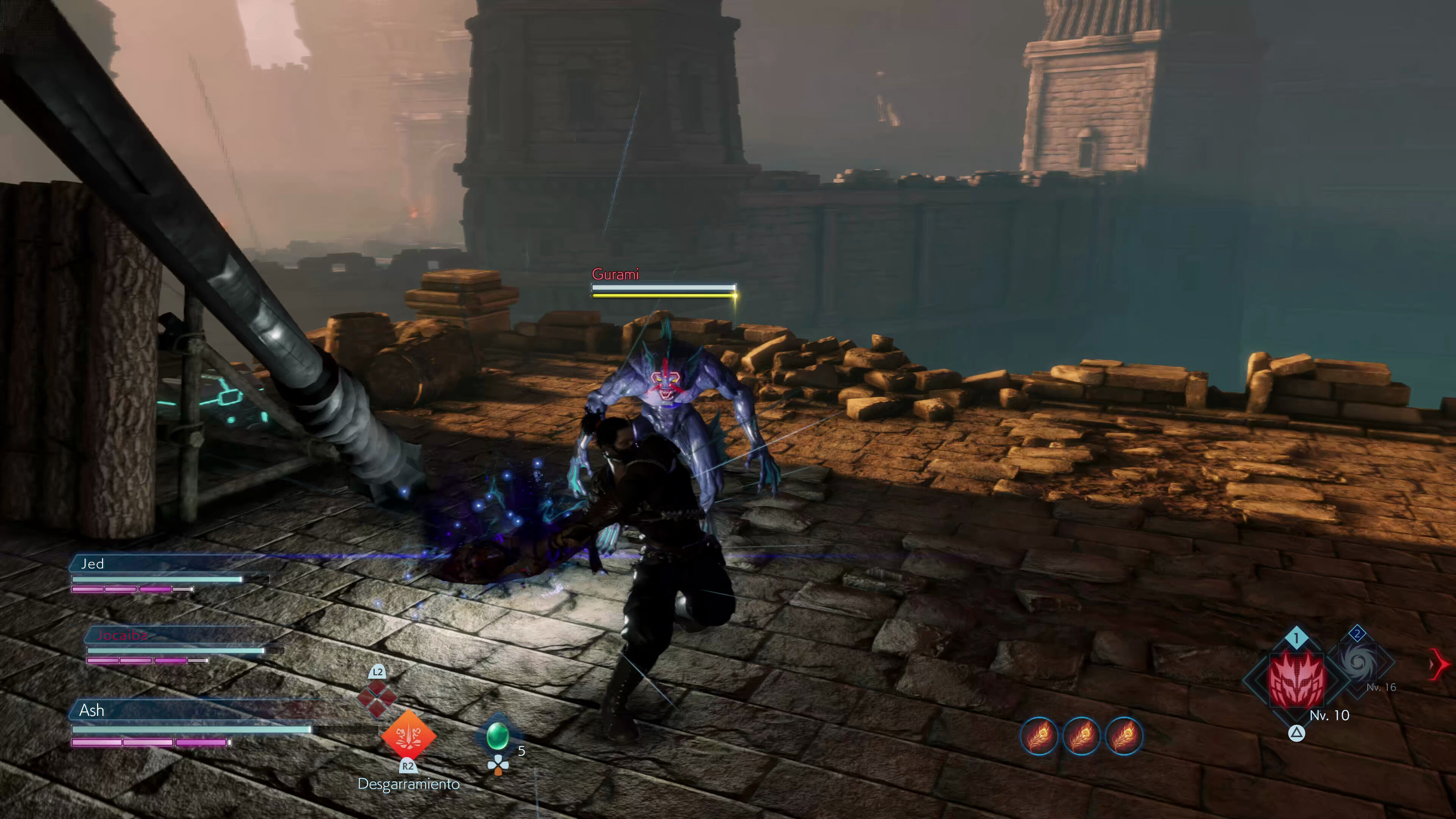 Por su parte, la barra de postura se reduce con cada golpe que recibimos, consigamos bloquearlo o no (ya sea con la defensa básica o con Corazánima), y se regenera rápidamente siempre y cuando no hagamos ninguna acción. En el caso de que nuestro medidor llegue a cero, quedaremos aturdidos y totalmente expuestos, lo que suele tener consecuencias fatales. La buena noticia es que nuestros enemigos también tienen su propio indicador de postura y que muchas de nuestras técnicas son especialmente efectivas a la hora de reducirlo, así que podremos usar esta mecánica en nuestro favor para aturdirlos y ejecutarlos con un espectacular remate.