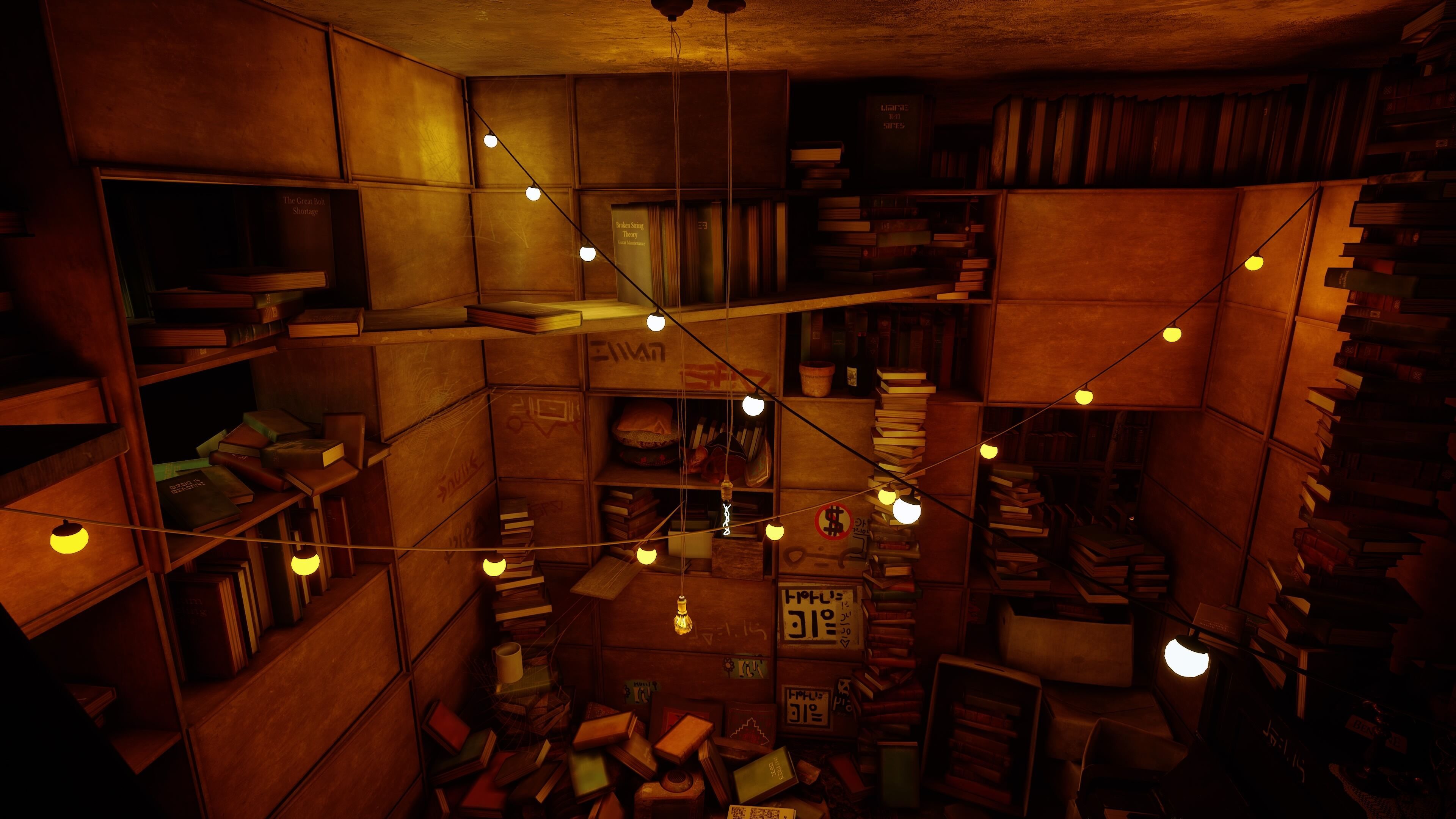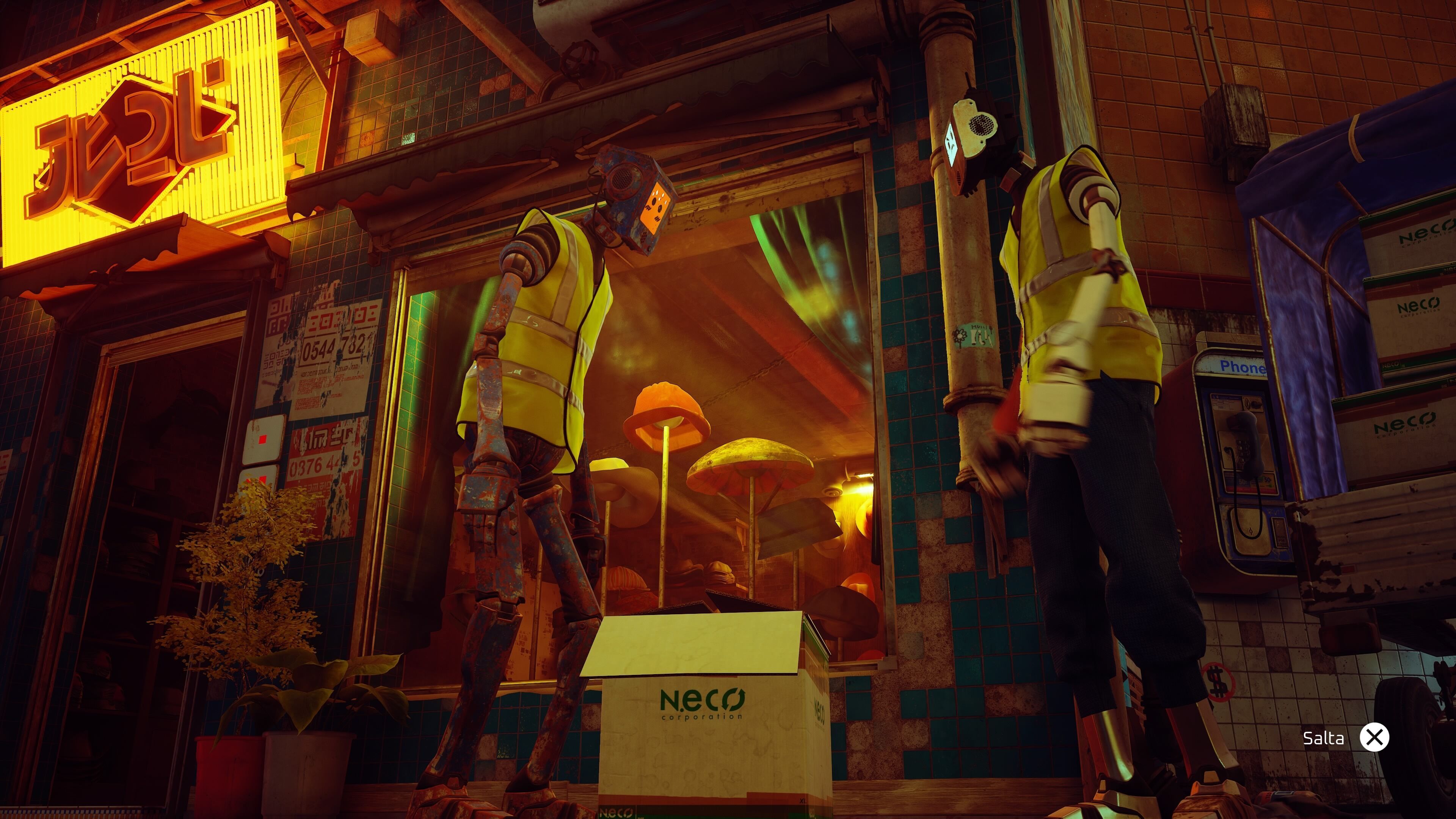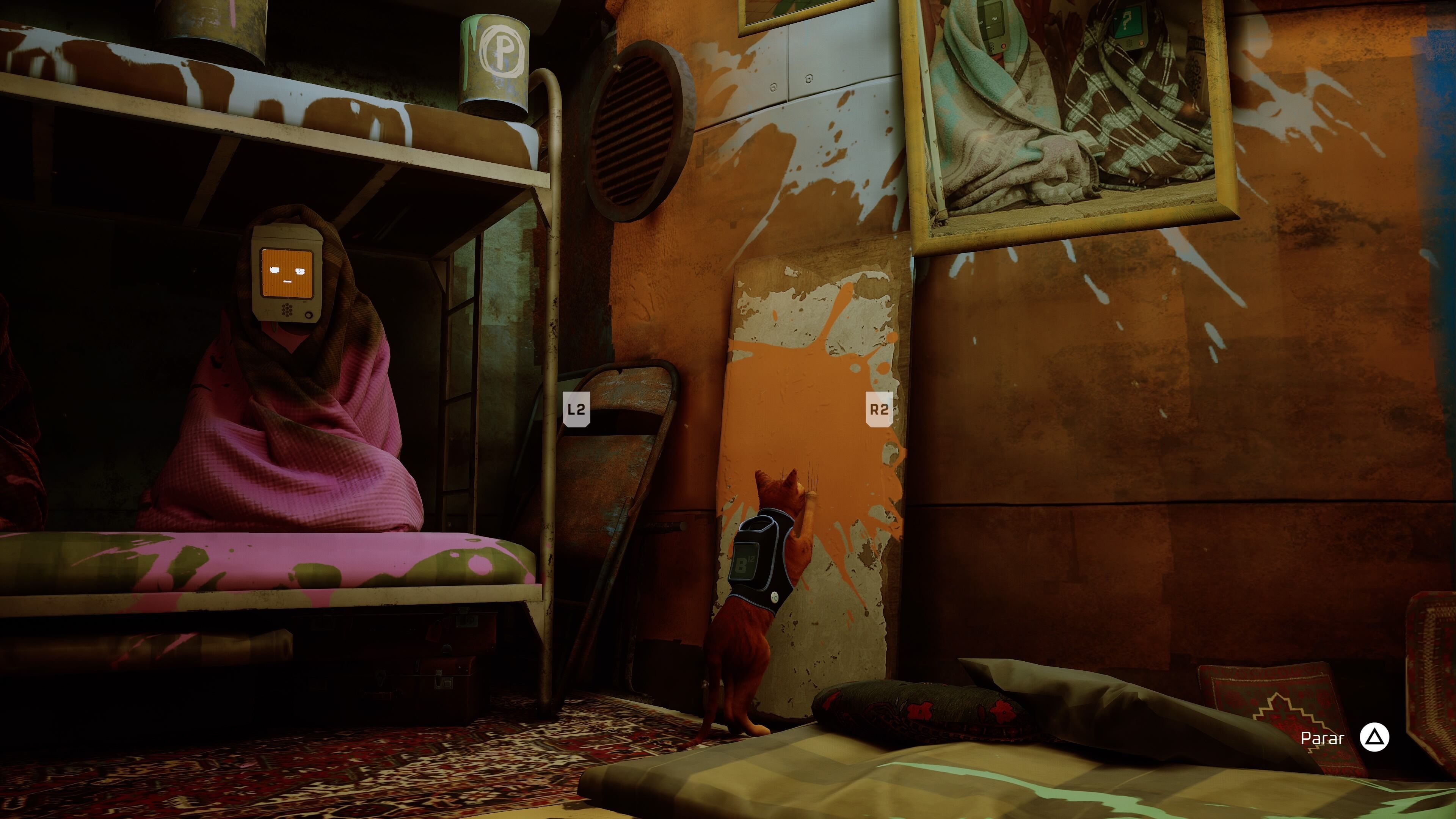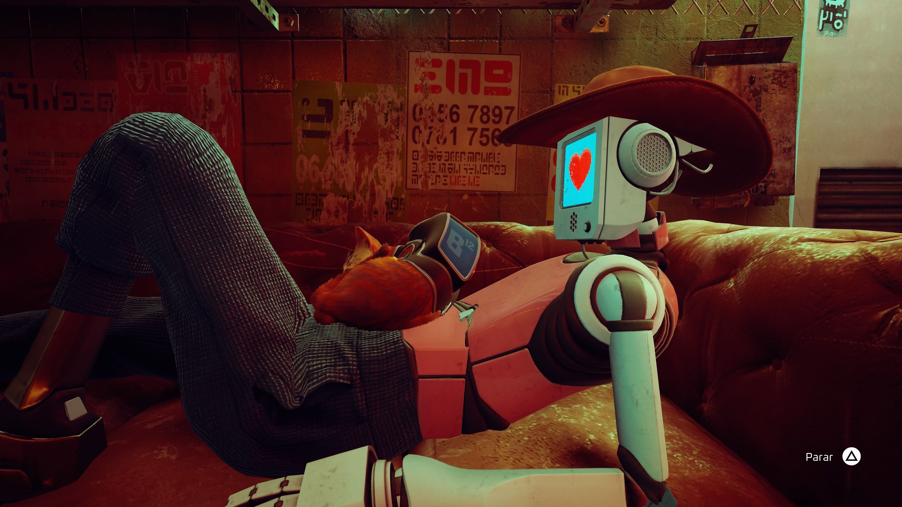 En lo segundo, sin embargo, han optado por una opción que percibimos como vaga y decepcionante. En lugar de quebrarse la cabeza para hacer una historia guiada por la narrativa ambiental, por la expresividad gestual del gato callejero y los robots, han introducido un robot que acompaña al cuadrúpedo. Es una especie de altavoz inteligente volador y con orejitas con DeepL integrado: traduce los grafitis de la pared, lo que dicen los otros robots, las notas que encontramos, y nos ayuda en algún que otro puzle.