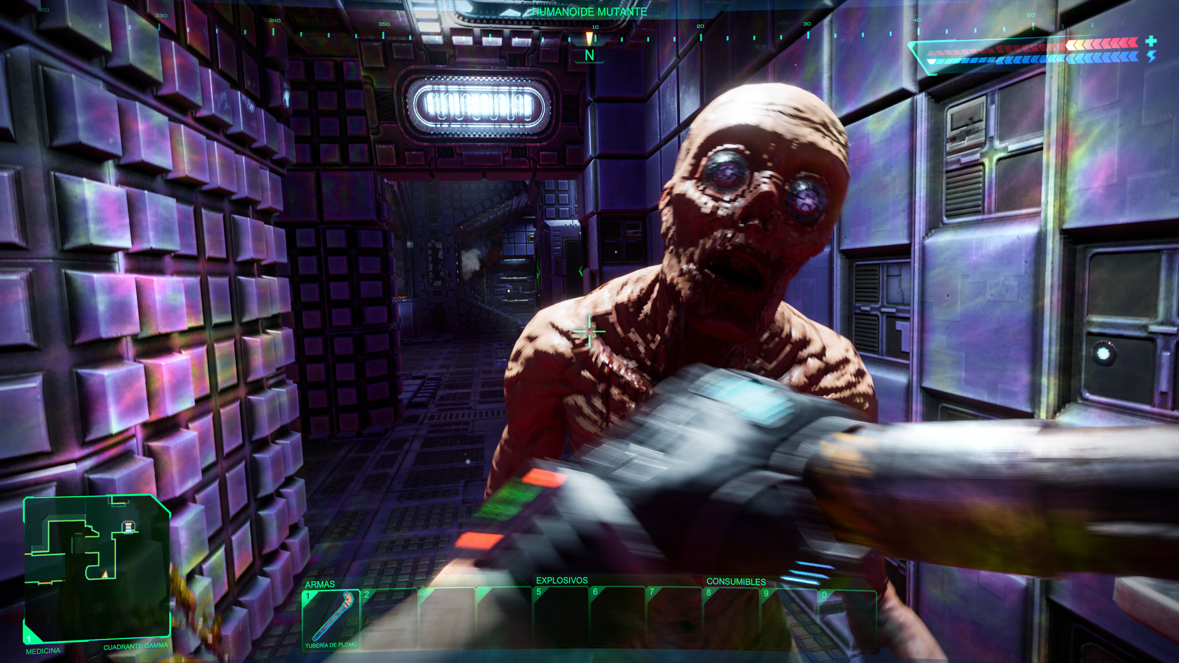 Curiosamente, los gráficos rehechos quedan –intencionadamente- en un punto intermedio entre lo viejo y lo nuevo: es más que una remasterización, pero la dirección artística se ha mantenido con gran fidelidad gracias a que los entornos respetan bastante la simpleza un juego 3D de mediados de los 90, e incluso sus texturas pixeladas, con efectos de iluminación modernos y unos enemigos que sí están modelados con más detalle. En consolas funciona estupendamente a 60 imágenes por segundo y lo cierto es que tras un tiempo en la Ciudadela este aspecto tan curioso termina por convencer. Quizás alguien prefiera un remake más drástico, pero correría el riesgo de quedar irreconocible y mancillar el legado de System Shock.