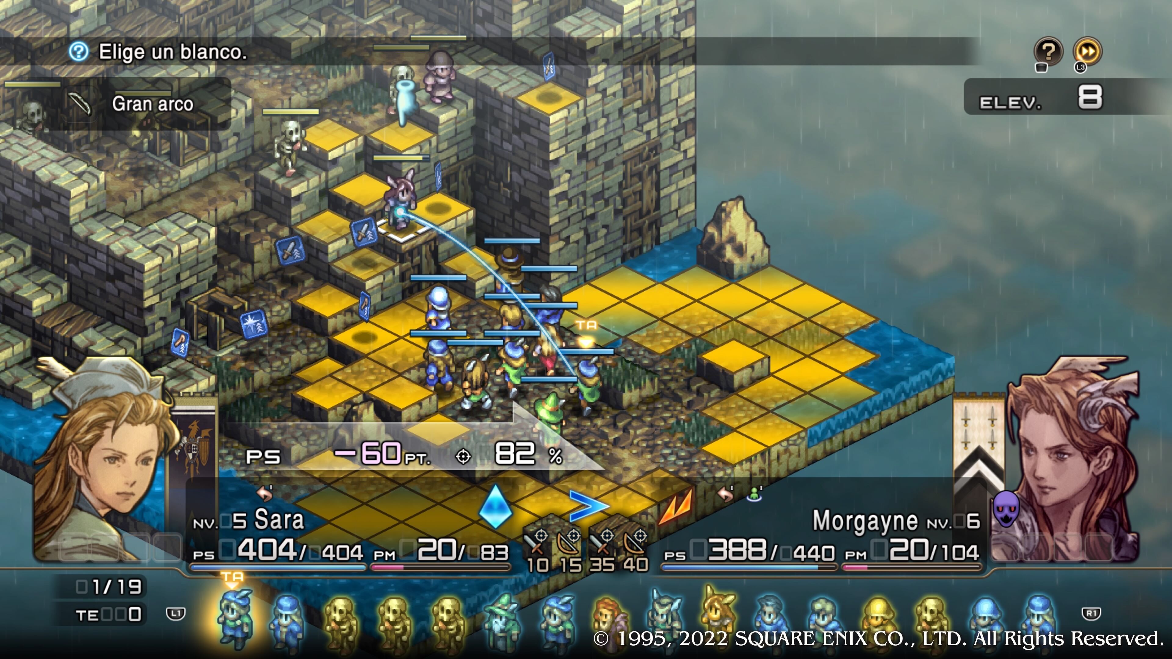 A diferencia de The DioField Chronicle y juegos con movimiento más libre, Tactics Ogre utiliza una cuadrícula que representa el terreno, las diferentes alturas y los obstáculos del camino. A medida que avanzamos por el mapa del mundo, con nodos que activan eventos de historia o batallas, participaremos en combates con nuestras unidades, cada una especializada en un tipo de ataque, magias y mayor o menor desplazamiento. Aunque no vamos a profundizar mucho en el gameplay, descrito en pasados análisis, Tactics Ogre: Let Us Cling Together de PSP hizo cambios en la jugabilidad, entre ellos la posibilidad de retroceder turnos y cambiar nuestros movimientos en la batalla con el sistema El Carro, algo que permite evitar el mal rumbo de una partida; hablando de reescribir el pasado, también permite cambiar decisiones en la historia y alterar esas decisiones con impacto en los acontecimientos.