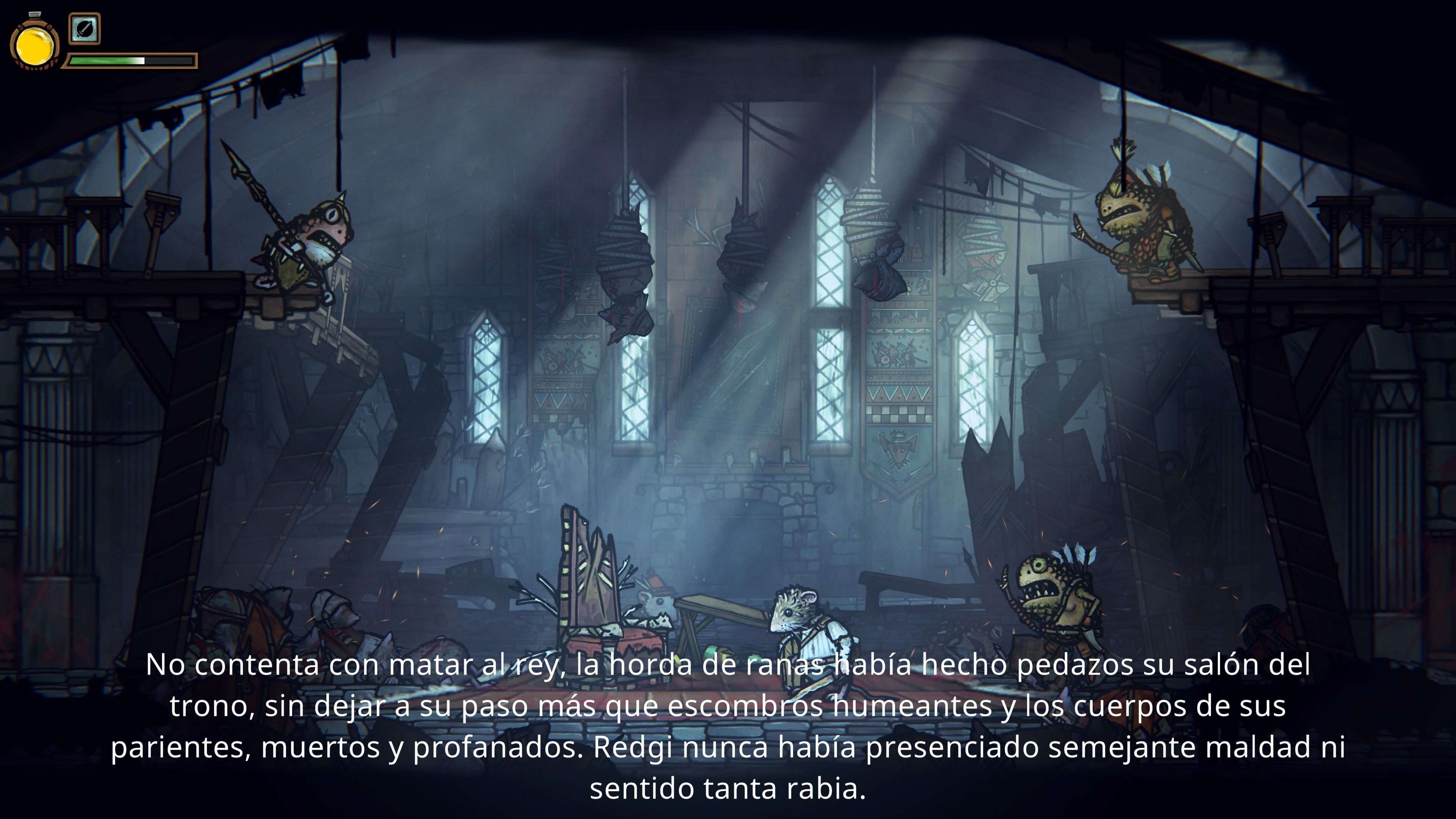 Se podría decir que Tails of Iron se inspira en los cuentos infantiles, tanto en los aspectos de narrativa como en su estética, aunque el punto de partida es un poco dramático. El argumento –contado por una voz en off- nos habla de un país golpeado por la guerra entre ratas y ranas que, durante algún tiempo, logró la paz cuando un caballero expulsó a al clan de Verruga Verde. Sin embargo el tiempo no pasa en balde y este rey envejece, ya no es capaz de empuñar la espada ni liderar los ejércitos. Cuando vuelve la amenaza de las ranas es el momento de buscar a un digno heredero al trono, Redgi, el hijo menor del rey. Es valiente pero un poco inexperto, y no tendrá mucha opción para dudar de su papel heroico: las ranas asaltan el reino, matan al monarca y solo él podrá rescatar a sus hermanos y reconstruir el reino.