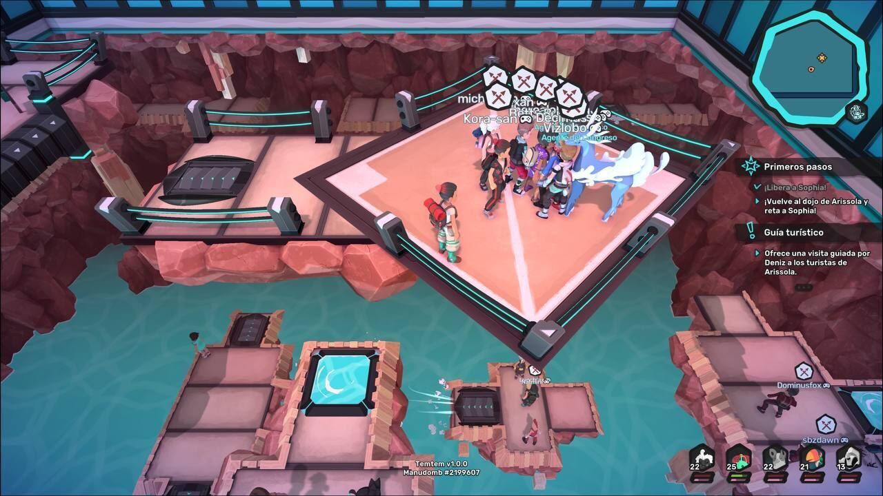 Una de las principales características que llaman la atención de Temtem es su faceta MMO, que convierte la experiencia tradicional de monster taming en un multijugador masivo online transformando su colorido universo en un escenario compartido con otros jugadores. Pese a que en sus bases narrativas justifica la presencia de tantos entrenadores, lo cierto es que a veces se generan momentos de caos con la pantalla llena de personajes correteando siendo perseguidos además por sus respectivos temtem. Cuando esto ocurre fuera de las ciudades se le suma que muchos de estos jugadores se quedan parados delante de NPC rivales, dando la sensación de que están haciendo cola para pelear (aunque todos, en realidad, estemos luchando contra el mismo personaje).