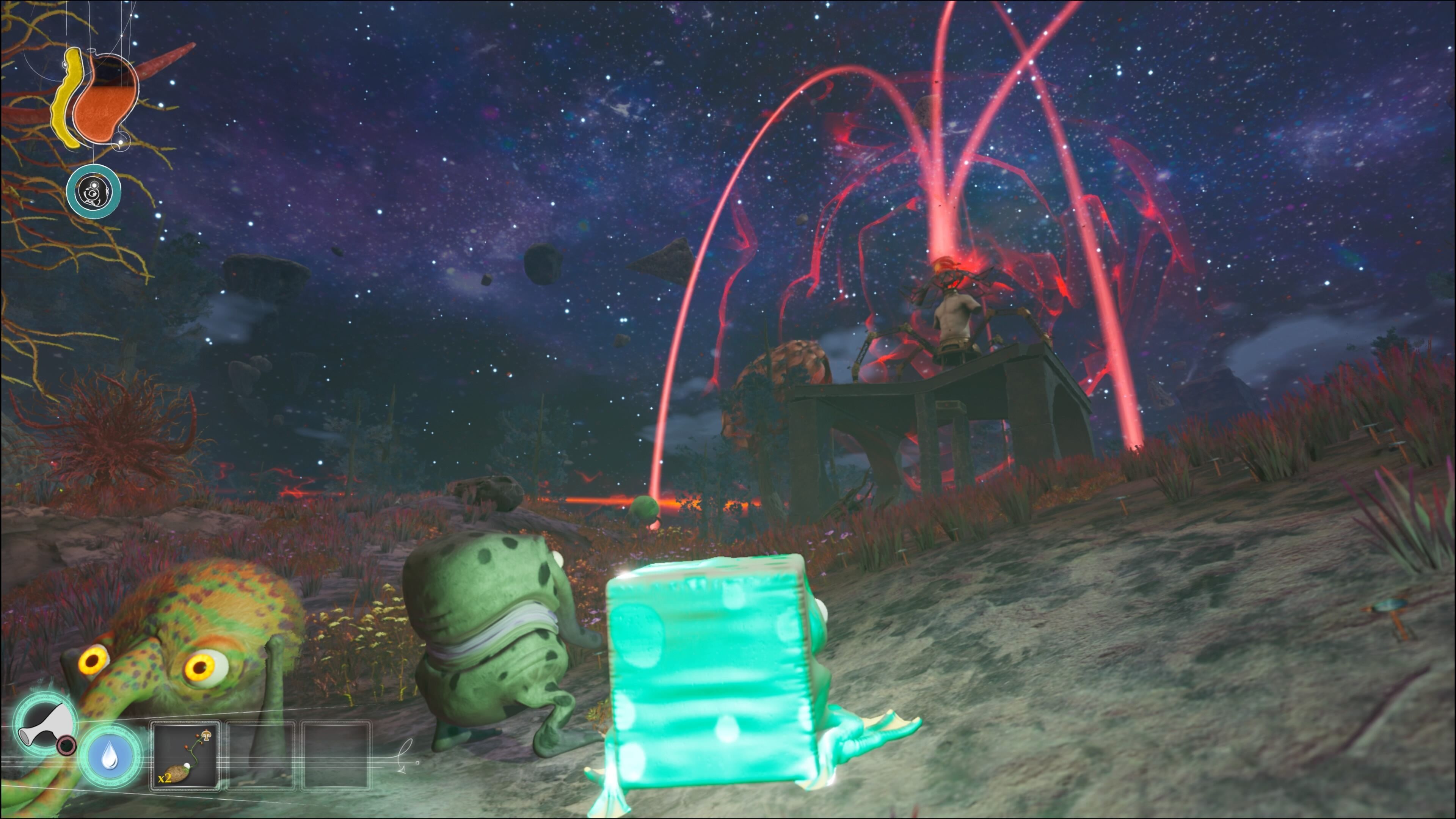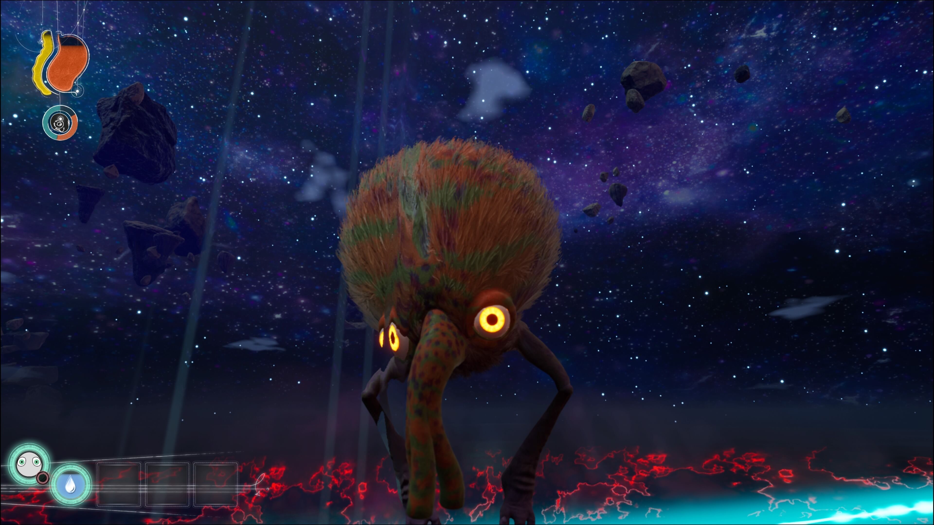 Las sensaciones que se desprenden de esta aventura son las que nos han animado a compararlo con pesos pesados como el rompedor Spore, juego al que nos recuerda por la importancia de las mutaciones y las formas tan peculiares que acaban dando, o The Legend of Zelda: Breath of the Wild, con el que (salvando las distancias) comparte ese afán de establecer reacciones físicas entre sus elementos para dejarnos que seamos nosotros quienes interactuemos con ellas de la manera en que queramos. Por supuesto su estilo artístico y la ambientación extraterrestre recoge algunas de las ideas que vemos en las criaturas y planetas de No Man's Sky, solo que aquí sin generación procedimental (lo cual afianza todavía más su visión y le saca más provecho a esa estética).