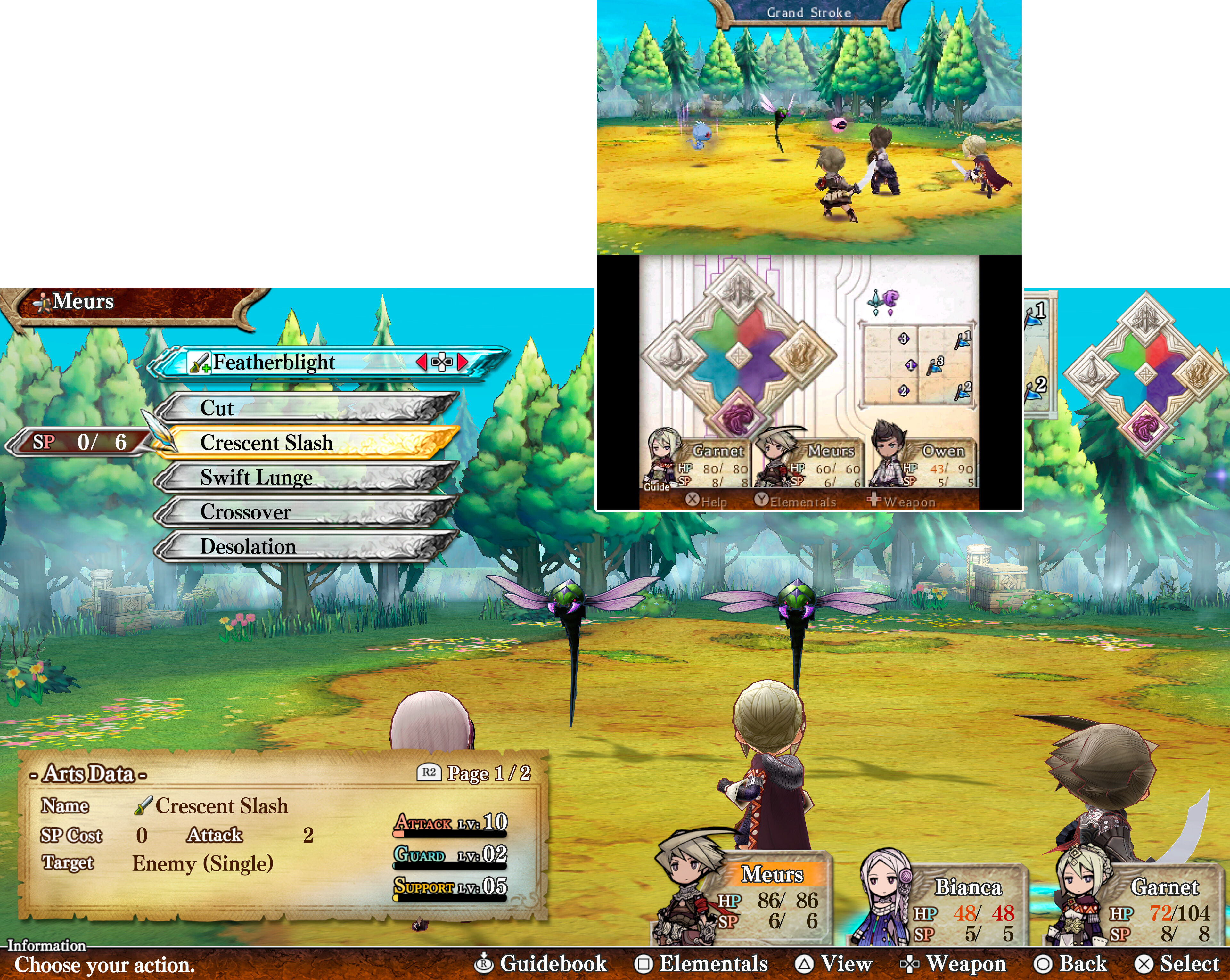 Por supuesto hay aspectos que podrían estar mejorados en la revisión. Hay localizaciones o escenas donde el contraste entre el material original y el mejorado desentona un poco, y tampoco se ha modificado el efecto de "generación" del escenario en las mazmorras –los árboles "crecen" y se esfuman delante de tus narices, incluso si esta zona ya es conocida-. Quizás sea una decisión para mantener el mismo estilo del original, tipo libro con desplegables, pero resulta incómodo a la hora de explorar. La interfaz durante los combates nos ha parecido un poco intrusiva, similar a lo que sucede cuando los juegos de móviles dan el salto a sistemas domésticos, aunque hay que tener en cuenta que el equipo ha necesitado reordenar la información: en Nintendo 3DS la interfaz se distribuía en dos pantallas.