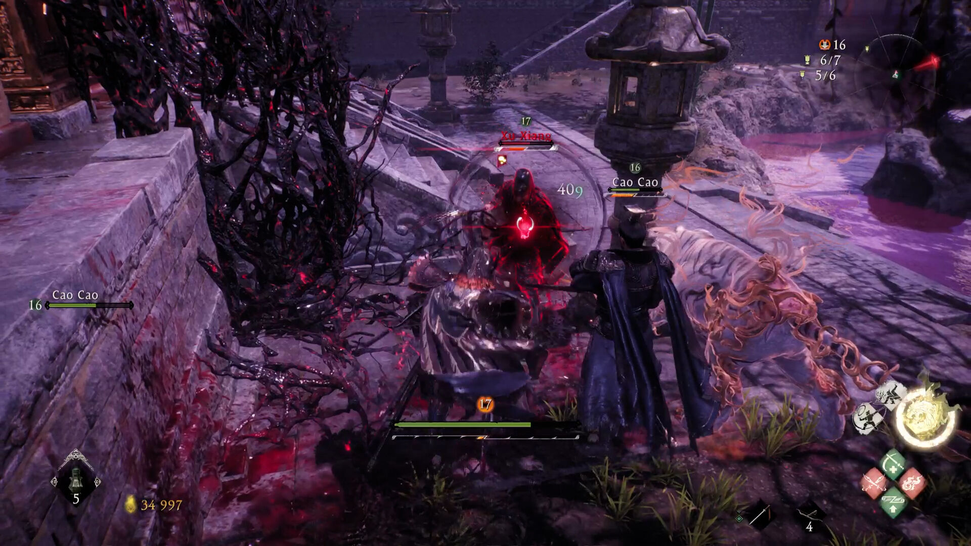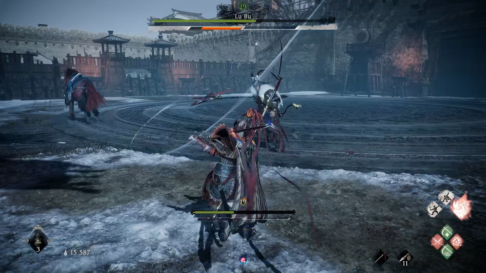 En la relativa ausencia de dificultad también influyen los acompañantes, claro, pero menos de lo que podría pensarse. Wo Long puede jugarse en cooperativo online (sin juego cruzado) para hasta tres jugadores. A falta de ellos, en algunas fases te acompañan uno o dos personajes de la historia que encajan en esa misión y aportan algo de contexto con sus diálogos; por supuesto, se puede ir en solitario en todas las misiones utilizando un objeto del inventario.