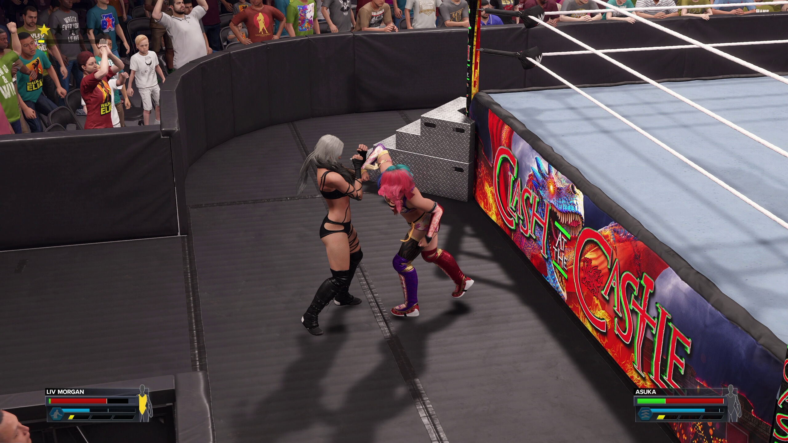En cuanto a los tipos de combate, tenemos todos los que habíamos visto en otras ocasiones, TLC, sumisión, Hell in a Cell, Last Man Standing… a los que hay que añadir los WarGames, un tipo de pelea creado por Dusty Rhodes en 1987 que ha vuelto a hacerse popular en la actualidad en la WWE y que llega ahora al videojuego, con combates en los que vemos dos rings metidos dentro de una enorme jaula en los que viviremos enfrentamientos sin descalificación de 3v3 o 4v4, pudiendo destrozar a nuestros rivales (o que nos hagan papilla) con sillas, mesas, palos de kendo, subir por la verja metálica de la jaula para tirarnos desde la parte superior y mucho más en unos encuentros caóticos, frenéticos y divertidísimos.