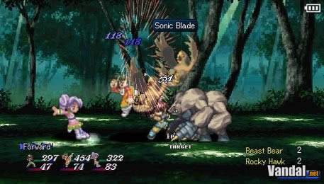 El juego, eso sí, cuenta con algunos momentos en 3D, pues el mapa del mundo, por el que nos desplazamos de una localización a otra sí está construido con polígonos, y presentado desde una perspectiva isométrica que podemos rotar para obtener la perspectiva más adecuada. La verdad es que estos pasajes 3D están algo desmejorados con respecto al resto del apartado gráfico, y es que para las dos dimensiones el tiempo no pasa. Fondos, diseños de personajes (en combate y fuera de él), el paso del día y la noche… todo está realizado con un gran gusto en Tales of Eternia, conformando una gran presentación del juego que se ve complementada por las secuencias de animación (como el vídeo introductorio) que van apareciendo aquí y allá. Un juego sublime en este apartado que, eso sí, cuenta con unas animaciones bastante cuestionables. De hecho, el principal problema del juego será su principal atractivo en este campo: hay un sector del público reticente a dedicar tiempo a juegos que no estén realizados con gráficos tridimensionales.