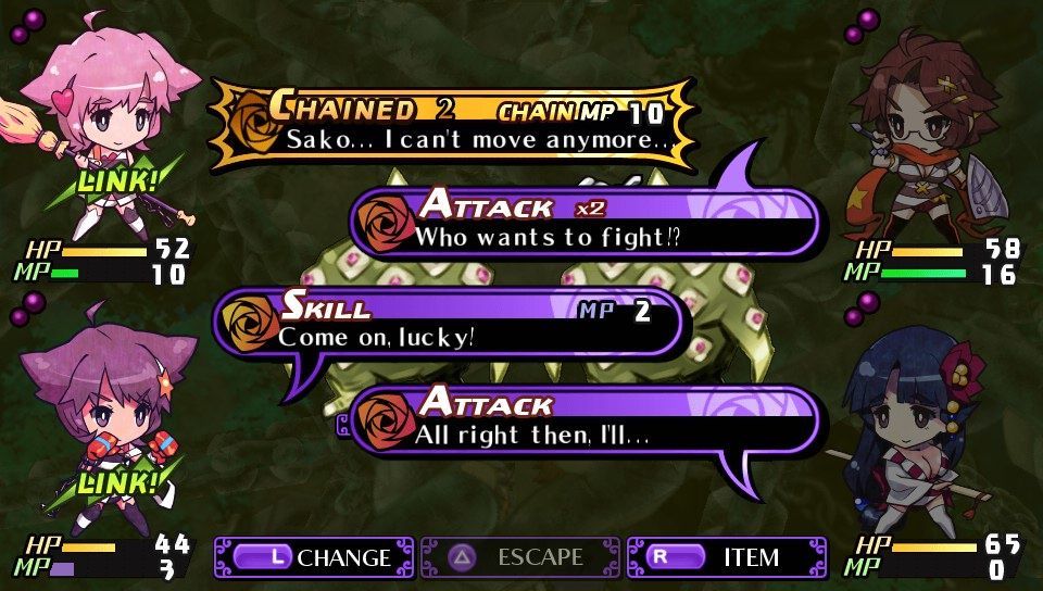 Las criminales aprenderán primero los comandos básicos de ataque y después, según lo que denominaríamos clases, habrá quienes tiendan más a las magias, la fuerza bruta y otras estrategias, tipo defensas. Lo curioso del asunto es que los combates no se juegan como un Final Fantasy o Dragon Quest tradicional, sino que son ellas quienes ofrecen en cada turno lo que pueden hacer, y elegimos en base a eso. Se refuerza así la idea de personalidades que no controlamos totalmente, aunque en la práctica la jugabilidad tampoco cambie enormemente respecto a citados RPG.