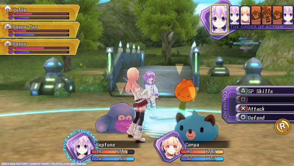 Es posible personalizar la cadena de combos con cuatro ataques y activar la transformación del HDD consumiendo una gran porción de los SP. La lucha es uno de los apartados que más nos ha gustado, al menos porque no se trata de la mecánica estándar que puedas encontrar en decenas de otros JRPG. Además, no deja de ser curioso cómo todo el juego gira en torno a guerra de las consolas y cómo avanzar cumpliendo misiones subirá el porcentaje de seguidores de la diosa, que revierte en beneficios para el combate.