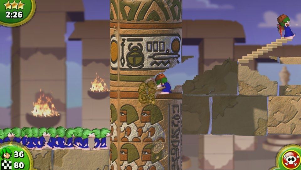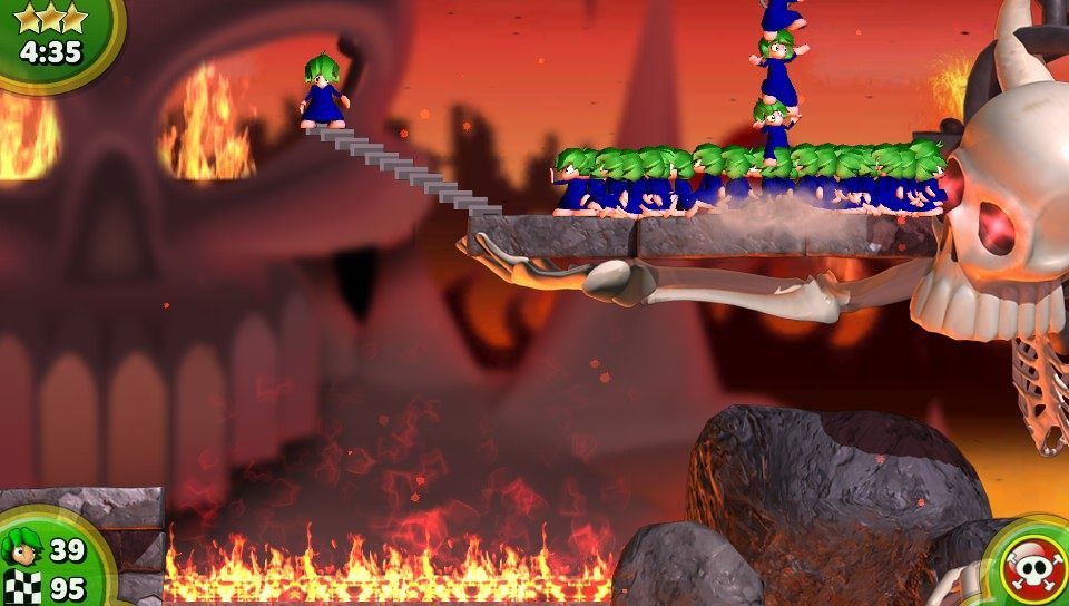 Las pruebas, además, valoran nuestro rendimiento con estrellas, lo que nos anima a repetirlas hasta conseguir las tres que guardan cada una. Si no nos vemos muy animados, tendremos que conseguirlas antes o después igualmente, ya que se necesita conseguir una cantidad determinada de estrellas para progresar a la siguiente dificultad. Por último, también nos encontramos con desafíos para conseguir monedas y poder comprar objetos de personalización para los Lemmings.