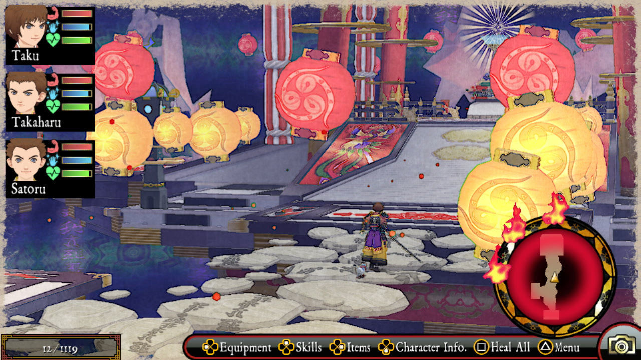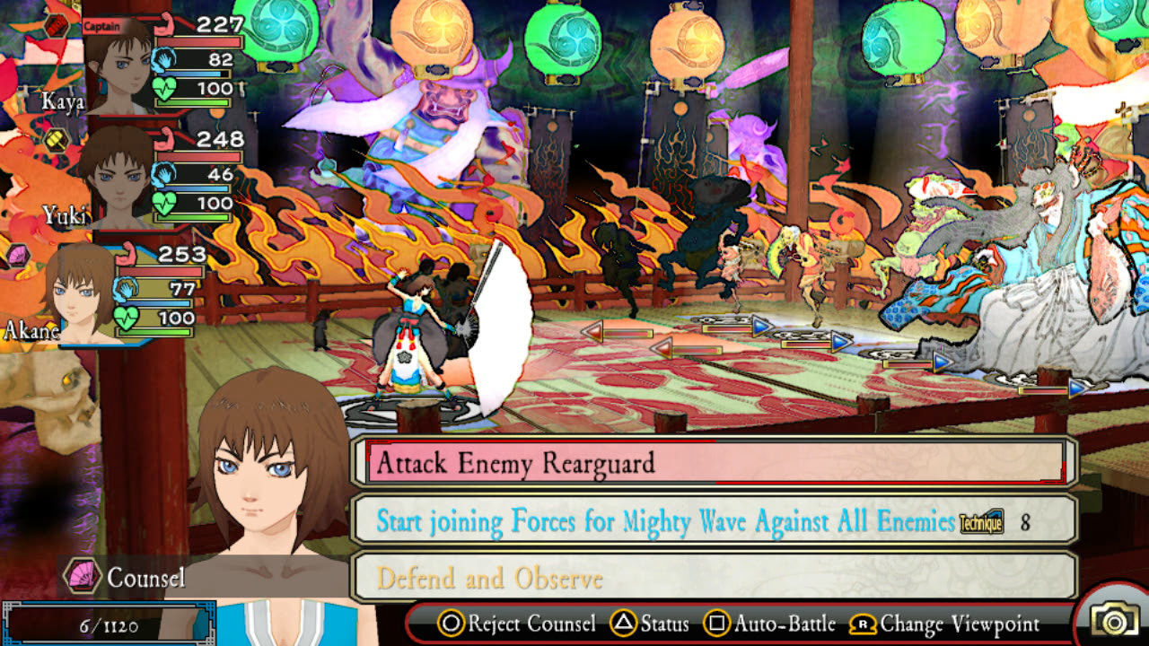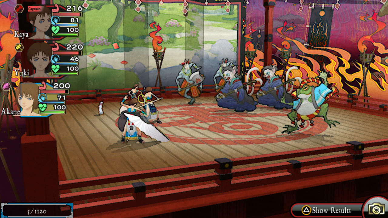 Oreshika tiene algunas de las mejores mazmorras del género a nivel visual y están generadas aleatoriamente para cada jugador. Muchos otros RPG usan este sistema, pero es fácil detectar que se trata de laberintos genéricos sin mucho adorno, aburridos pasillos y salas. Aquí por supuesto también hay elementos que se reciclan, pero está mucho mejor disimulado, sea por el grado de detalle o los diferentes ambientes que encontramos. El tipo de textura de papel y las siluetas imitando dibujos de la era Heian dan un aspecto muy distintivo, repleto de colorido y pequeñas siluetas. Como en Valkyria Chronicles, el arte trasciende sus limitaciones técnicas. Salvo que el tipo de arena de combate es casi siempre la misma, este título muestra en general un buen acabado.