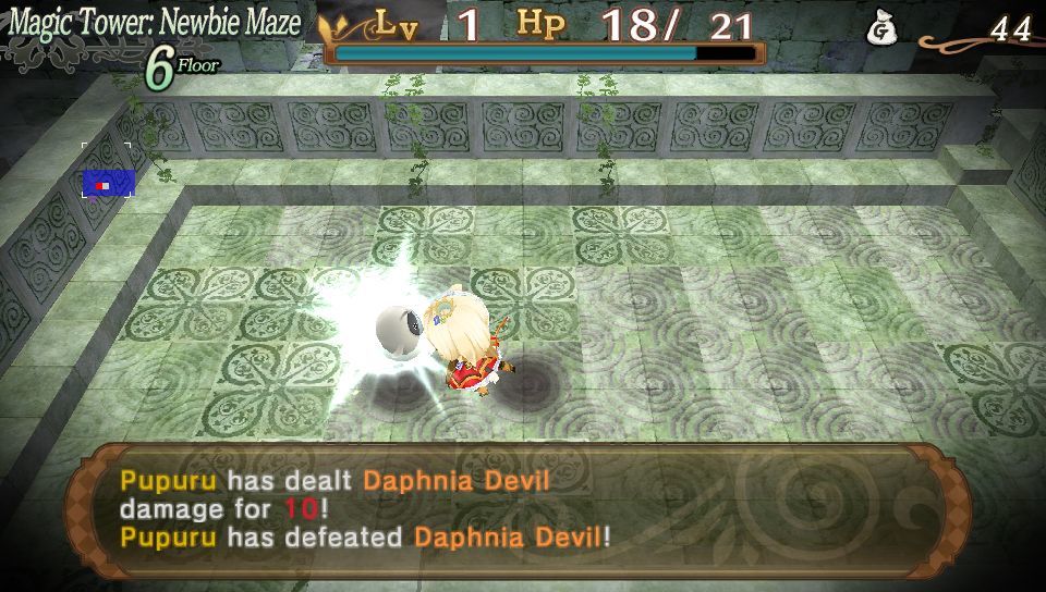 El sistema de juego se basa en el subgénero roguelike, mazmorras de exploración con combate por turnos en el que navegamos por un escenario dividido, aunque sea de manera un poco invisible, en una cuadrícula –rejilla que puedes visualizar en cualquier momento-. Las acciones se realizan por turnos, de manera que tu desplazamiento por la zona, o cada acción de combate, hace que los oponentes que pulan por la mazmorra se muevan. No es un juego de acción pura y dura, aunque se pueda jugar casi sin pausas. Hay convenciones típicas de estos juegos, por ejemplo el mapa lo vamos descubriendo a medida que avanzamos por estos entornos laberínticos para alcanzar las escaleras que simbolizan el paso a un nivel superior. Dispersos por el terreno encontraremos cofres con dinero, ítems o equipo, así como algunos personajes de compraventa. También se nos resetearán los parámetros al empezar cada mazmorra, es decir, habrá que subir de nivel en cada localización y no importa cuánto lo hayas hecho antes, porque no lo acumulas en siguientes escenarios temáticos.