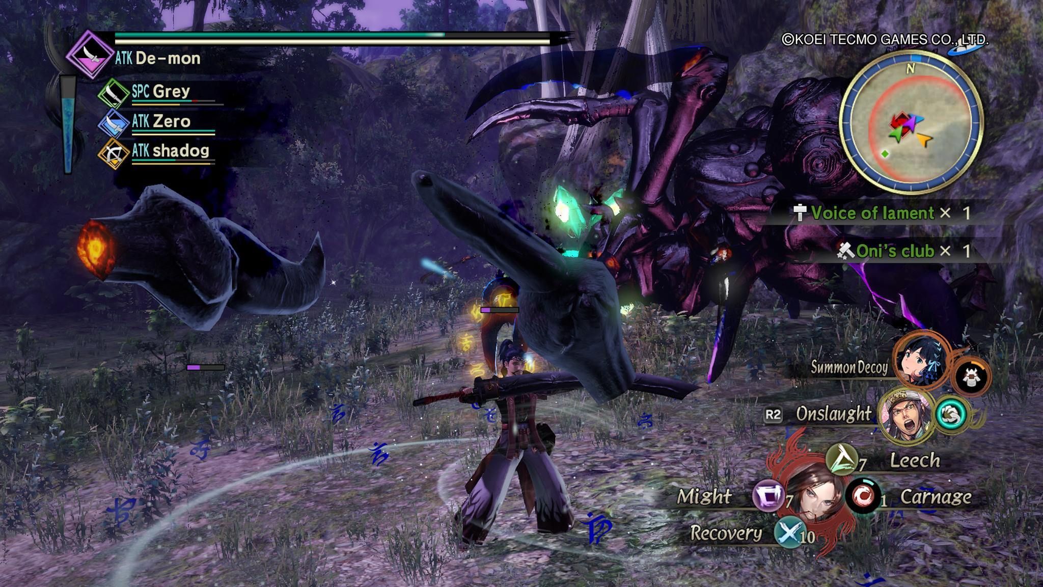 Ciertas regiones del mapa estarán contaminadas por el miasma de los Oni, una nube tóxica que perjudica nuestro estado si rebasa el umbral tolerable. Estas zonas se convierten en una lucha contra el tiempo y por alcanzar piedras que purifican nuestra corrupción, o para activar unos monumentos que despejan el área de este aire malsano –previo enfrentamiento con un subjefe-. Toukiden 2 aprovecha su nuevo mundo con importantes mejoras respecto a su predecesor y gana en la sensación de aventura sin perder de vista que es 100% un juego de cacería.