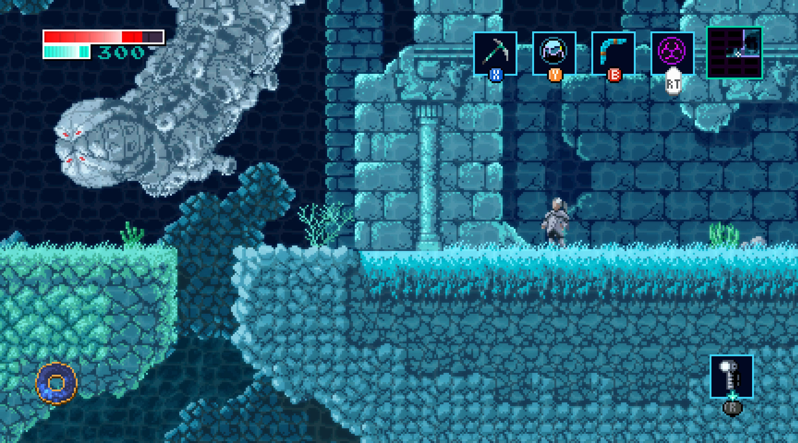 La jugabilidad también ha cambiado bastante, ahora no nos dará esa sensación de Metroid indie que daba la primera parte, el mapa es mucho más abierto y combatiremos cuerpo a cuerpo —piqueta, hacha, etc— la mayoría del juego. Pareciera por momentos que en este caso se hayan inspirado más en otras sagas como Contra a pesar de que tampoco tenga su estilo run and gun, pero tendremos las máquinas y presencias alienígenas sobre escenarios de cataratas plataformeras. Además de estas armas principales contaremos con un bumerán y toda una serie de habilidades —brazos de nanomáquinas con nombre mesopotámico— que iremos encontrando y mejorando en el menú con unos frascos.