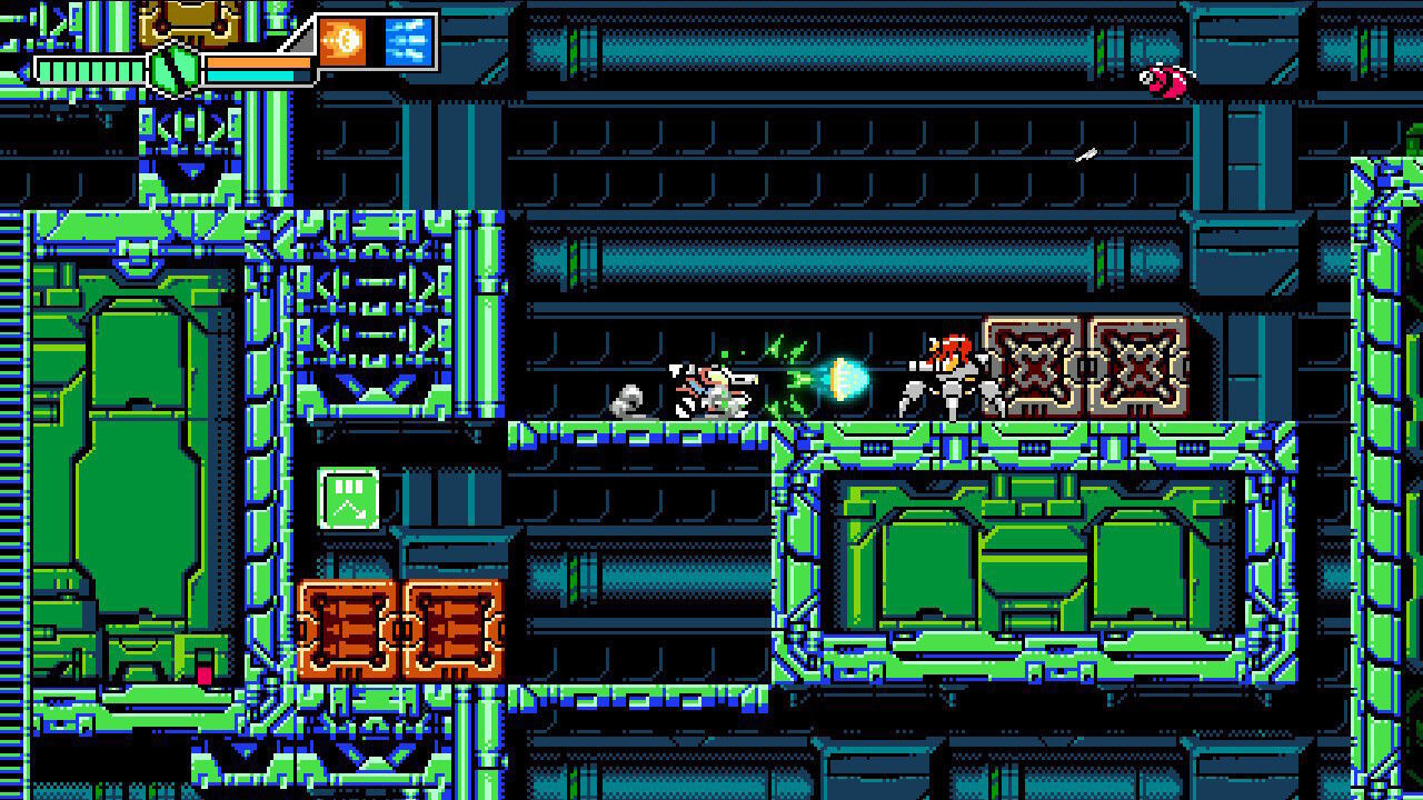 Entrando ya en materia gráfica, seguimos estando ante una obra que posee un aspecto muy retro, con una estética simple pero atractiva a medio camino entre los 8 y los 16 bits. Las animaciones están bastante conseguidas, el diseño de los escenarios es acertado y los enemigos resultan muy variados… aunque el diseño de muchos de ellos nos ha parecido poco inspirado. La ambientación espacial, en cambio, nos ha convencido plenamente, así como las ilustraciones de los personajes que se dejan ver durante las pantallas estáticas que van mostrando la narrativa (textos en inglés, por cierto). Una apariencia sencilla pero aparente a la que se suma un acabo sonoro más que decoroso, aunque para nosotros las melodías pasan en demasiadas ocasiones algo desapercibidas.