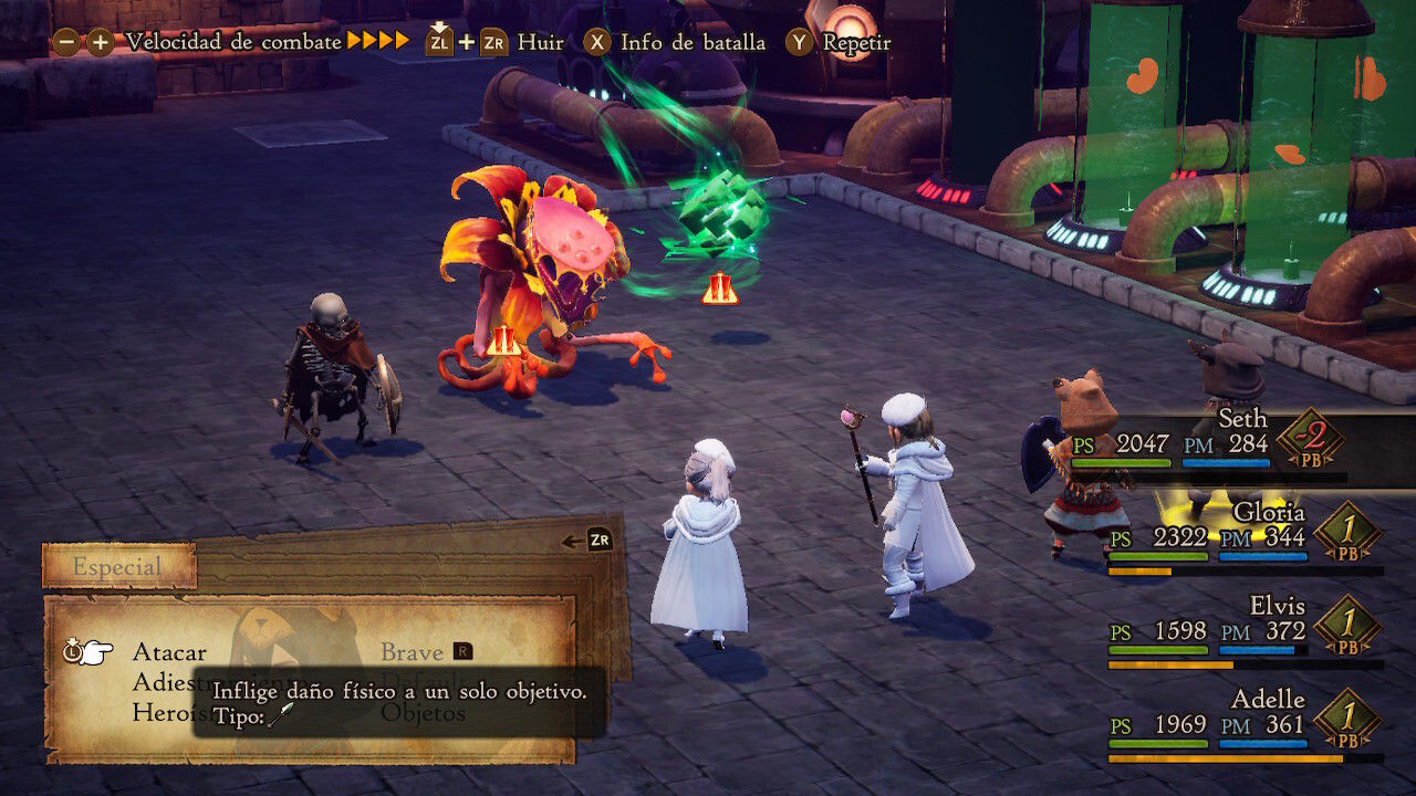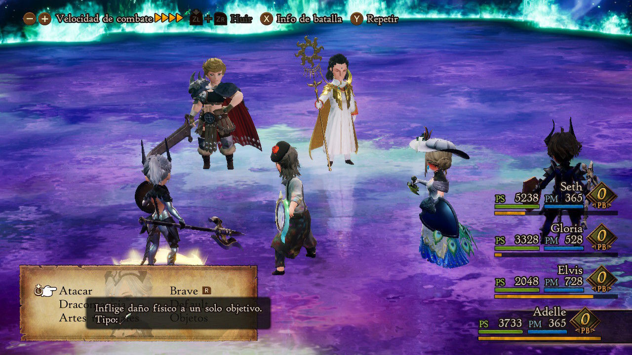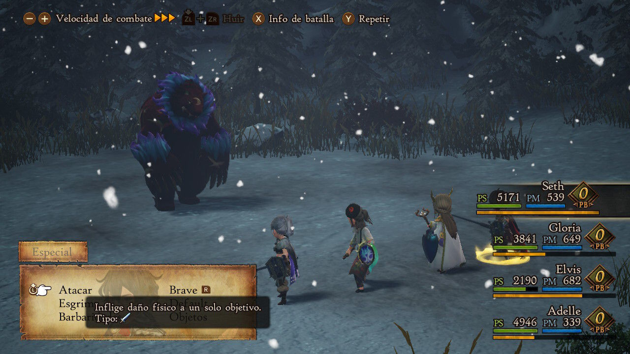 La fórmula es similar a lo que vimos en las dos entregas anteriores y nos propone unos combates por turnos clásicos que giran en torno a la gestión de los comandos Brave y Default, así como de nuestros PB. Resumiendo de una manera muy simplificada, cada vez que usemos Brave podremos realizar una acción extra en nuestro turno a cambio de un PB hasta un máximo de cuatro. Por otro lado, con Default nuestro personaje adoptará una pose defensiva para reducir daños y adquirirá un PB adicional además del que obtiene por cada turno que pasa.