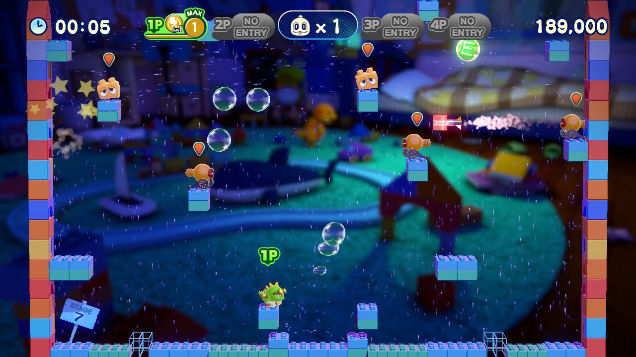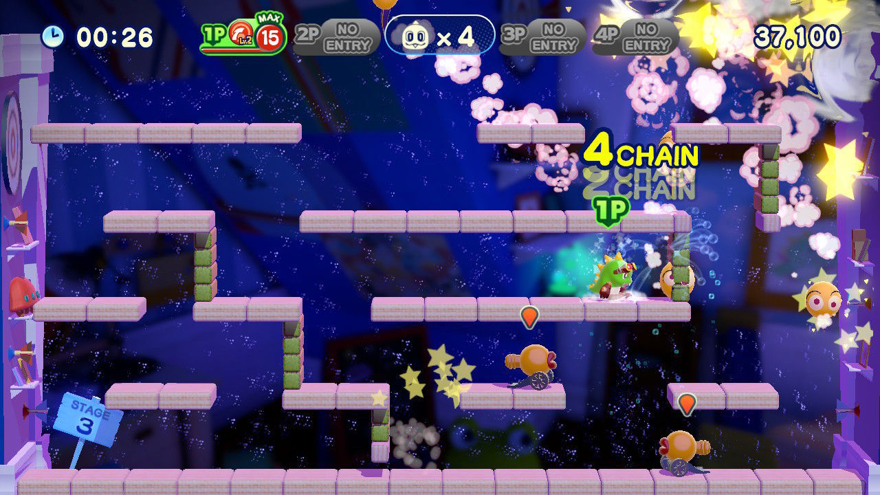 ¿Y cómo acabamos con ellos? Pues muy sencillo, mediante las burbujas que son capaces de lanzar por sus bocas los protagonistas para, una vez encerrados en ellas, explotarlas. Una mecánica de juego de lo más simple pero que lleva funcionando desde mediados de los 80 con muy buenos resultados. Y esto mismo vuelve a repetirse en esta nueva entrega de la saga, siendo el típico título "tontorrón" (si nos permitís la expresión) pero que resulta complicado dejar de jugar una vez te metes en él hasta que te lo acabas. Y, desgraciadamente, esto último no tarda demasiado en suceder, dado que los 50 niveles que forman parte del modo principal pueden ser superados sin demasiados problemas de una sentada… si bien la segunda vuelta, bastante más desafiante, prolonga durante un par de horas extra la vida útil del título.