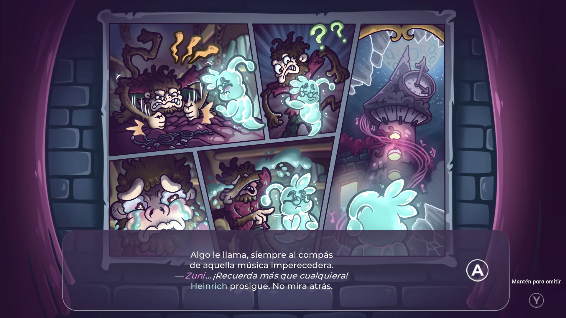 El planteamiento es sencillo pero está cargado de potencial, lo cual resulta simplemente perfecto para un juego de este estilo. Además, cada sección del juego se acompaña de secuencias al estilo cómic, con textos en español que nos narran los acontecimientos con un estilo poético. En definitiva, un gran trabajo que se acompaña de un apartado audiovisual muy competente, con melodías muy ambientales y unos gráficos caricaturescos que destacan sobre todo por las cuidadas animaciones. En cuanto al rendimiento, es bueno la mayor parte del tiempo, aunque en Nintendo Switch hemos sufrido alguna ralentización de lo más frustrante y en el peor momento (aunque únicamente en el modo televisor).
