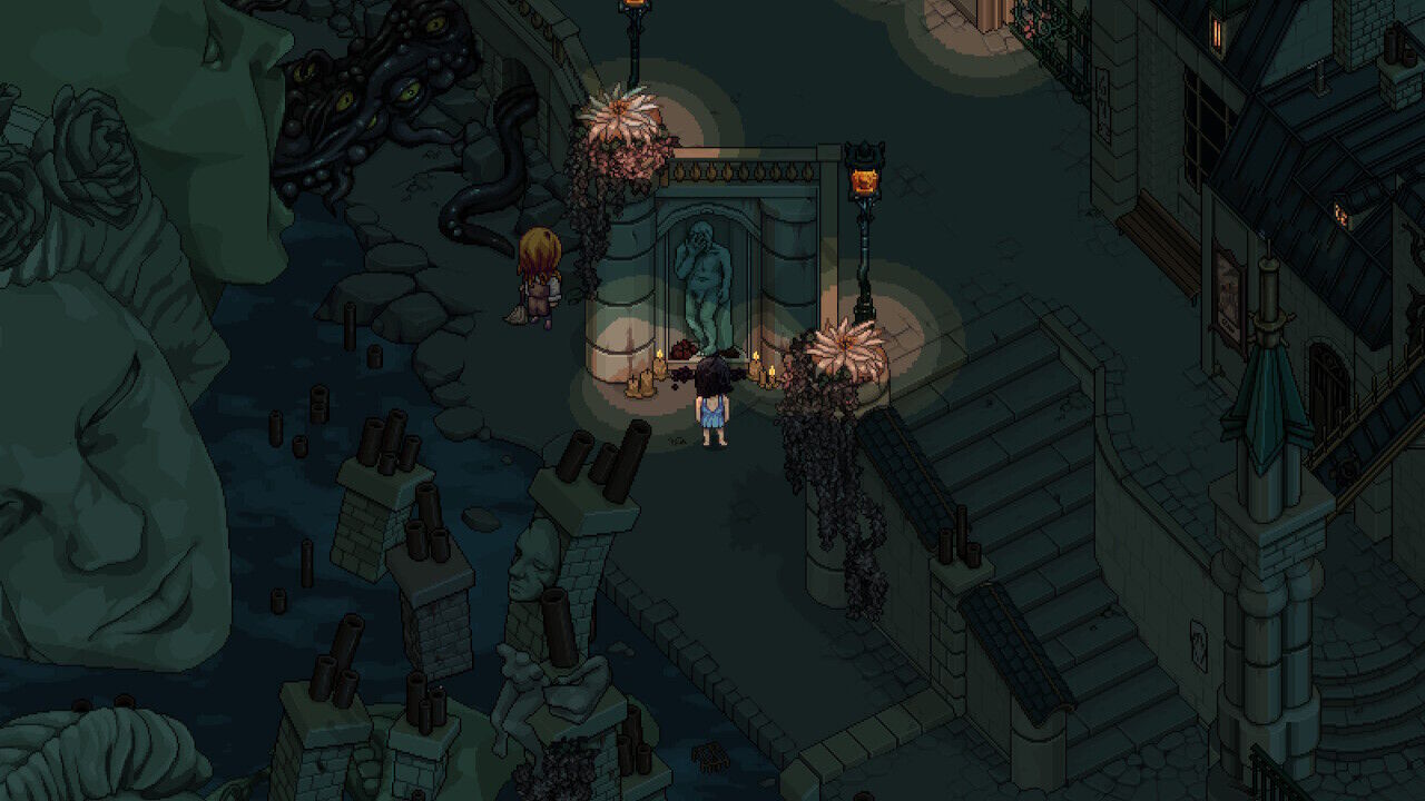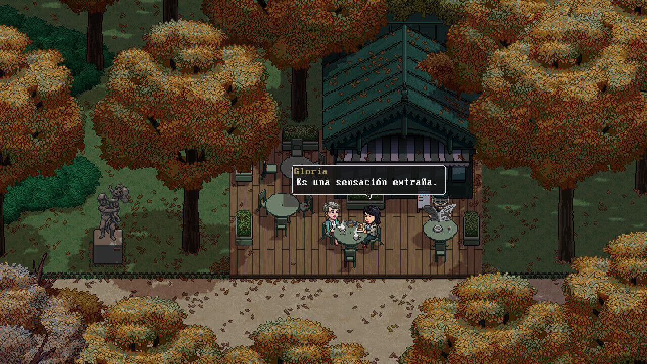 Todo esto viene presentado en un cuidado estilo pixel art en 2D que es otro de sus puntos fuertes, sin lugar a dudas. El diseño de los personajes puede ser lo que más desentona, porque parecen tener unas proporciones algo exageradas —igual que ocurría con los muñecos Pinypon o Polly Pocket—, pero a pesar de que esto puede no encajar demasiado en un primer vistazo, es cierto que uno se acostumbra. La calidad del pixel art es sólida durante todo el juego y los escenarios están bastante trabajados, así que eso es lo que termina de darle cohesión a toda la parte visual. Las animaciones también están conseguidas —salvo quizás la de caminar en diagonal— y de hecho se utilizan a menudo al narrar.