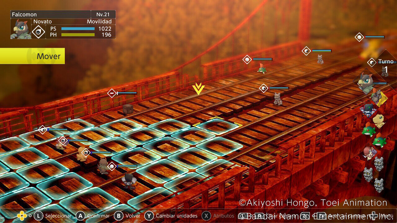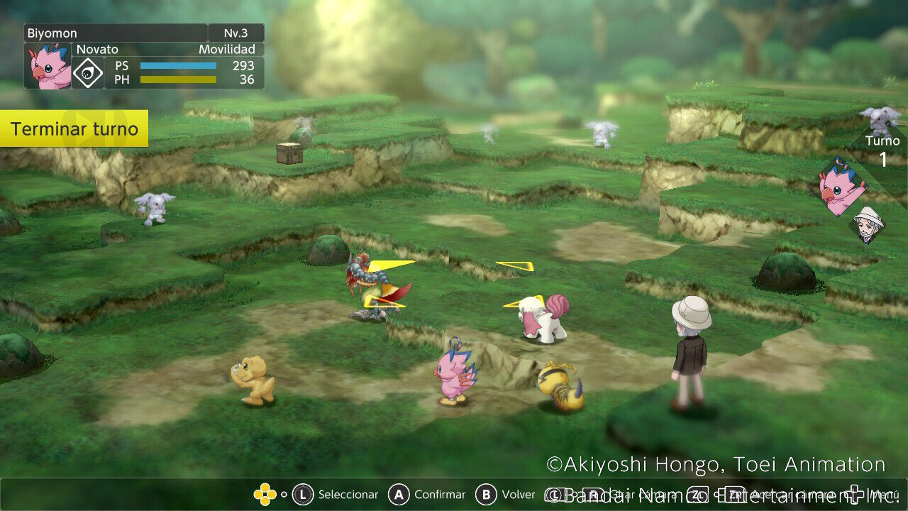 Como podréis intuir, a la hora de la verdad resultan en unos duelos extremadamente simples y sin ningún tipo de profundidad que no pueden competir con ningún referente del género. Los Digimon apenas tienen un ataque básico y uno especial (es posible que puedan usar uno o dos más si los equipamos con los accesorios correspondientes), no existen distintos tipos de terrenos, elementos interactivos u obstáculos, los mapas son muy pequeños, escasos y poco variados, y las unidades no requieren de mucha gestión. Para rematar, la dificultad es bajísima incluso en Difícil, por lo que tampoco nos quebraremos demasiado la cabeza desarrollando estrategias y la mayoría de las veces nos limitaremos únicamente a ir con nuestros monstruos digitales más fuertes abusando de sus mejores ataques para limpiar los escenarios en apenas unos pocos turnos.