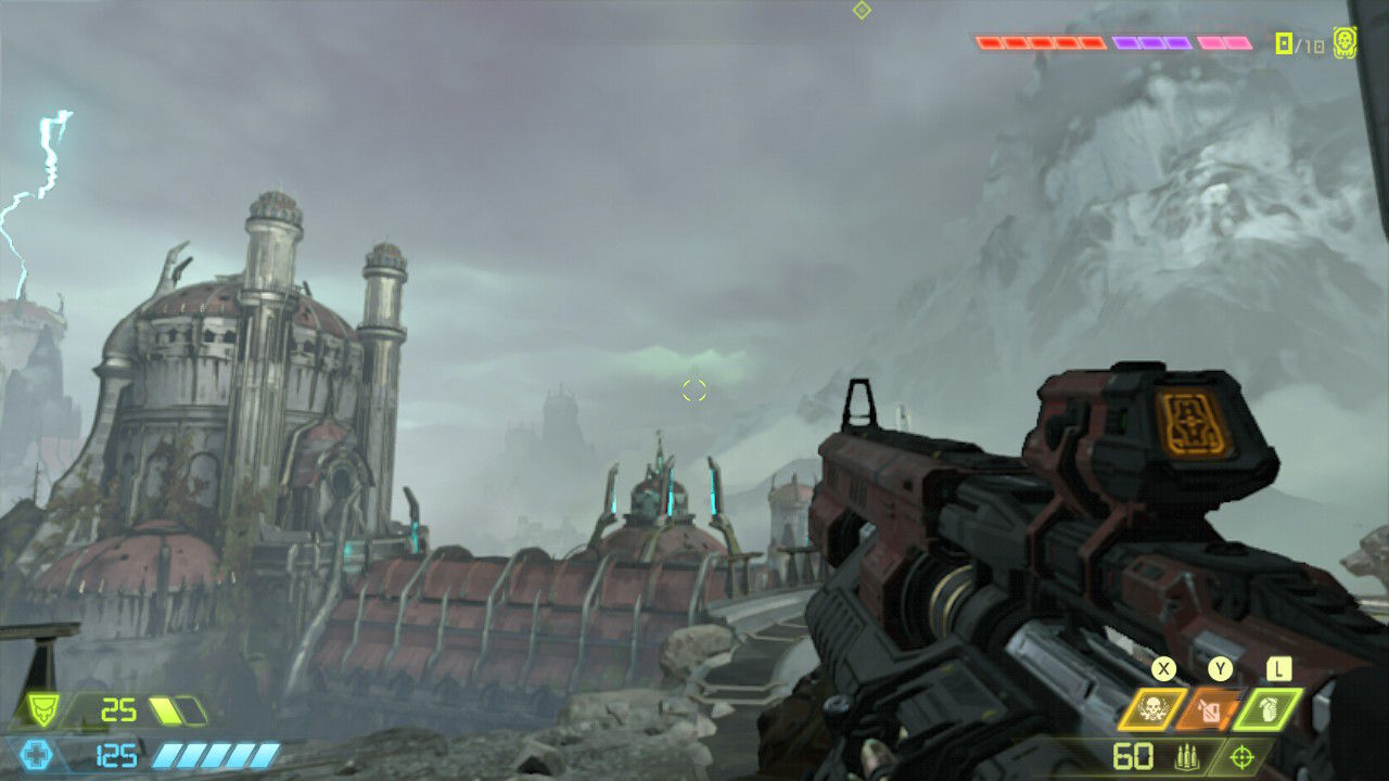 Por lo demás, Doom Eternal mantiene su esencia intacta. Sigue teniendo sus geniales escenarios, sus enfrentamientos frenéticos, su doblaje al castellano, su espectacular banda sonora y su jugabilidad tan bien medida. Todo, sólo que con recortes visuales que ahora vamos a comentar. Como nota, hemos jugado en Ultraviolencia, principalmente en portátil, y aunque la precisión de los Joy-Con no es la mejor, con el giroscopio se le acaba cogiendo el truco, pudiendo disfrutar de los niveles altos de dificultad.