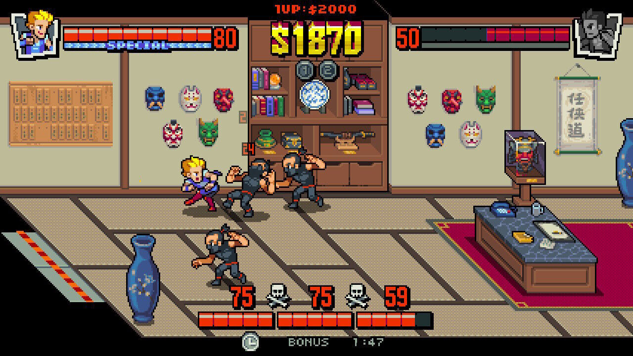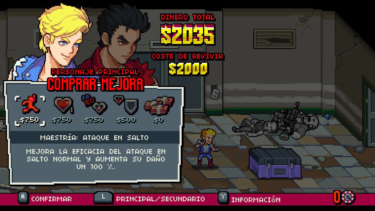 Entre fases también conseguiremos dinero para adquirir mejoras para nuestros justicieros, que cubren desde lo más básico –aumentar salud- a mejorar ataques u otras ventajas pasivas. Las necesitarás porque nuestros primeros pasos son pan comido, pero a medida que progresas se perdonarán menos los errores, echarás más en falta los alimentos curativos –que siempre puedes conseguir con los KO a tres o más enemigos- y te cruzarás con rivales mejor preparados. Hay un ajuste de dificultad muy detallado para adaptar distintos aspectos –desde la agresividad a nuestra vitalidad-, pero a más facilidad, el precio de las fichas subirá.