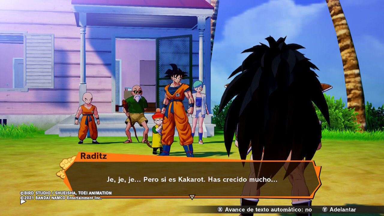 Así pues, la versión de Nintendo Switch vuelve a ofrecer un ARPG que comienza con Dragon Ball Z, justo cuando Raditz aterriza en la Tierra para buscar a su hermano –Goku- y continuar la conquista de planetas. Pero claro, nuestro héroe acaba de formar una familia y tanto él como sus aliados plantarán cara al guerrero; una historia contada con más pausa que otros videojuegos, al estilo rolero: con exploración, misiones opcionales, combates míticos y escenas cotidianas pocas veces vistas en juegos de Dragon Ball. Kakarot cuenta la historia original casi al pie de la letra, como hemos visto en múltiples ocasiones, pero la manera en que lo hace resulta fresca y respetuosa con el material.