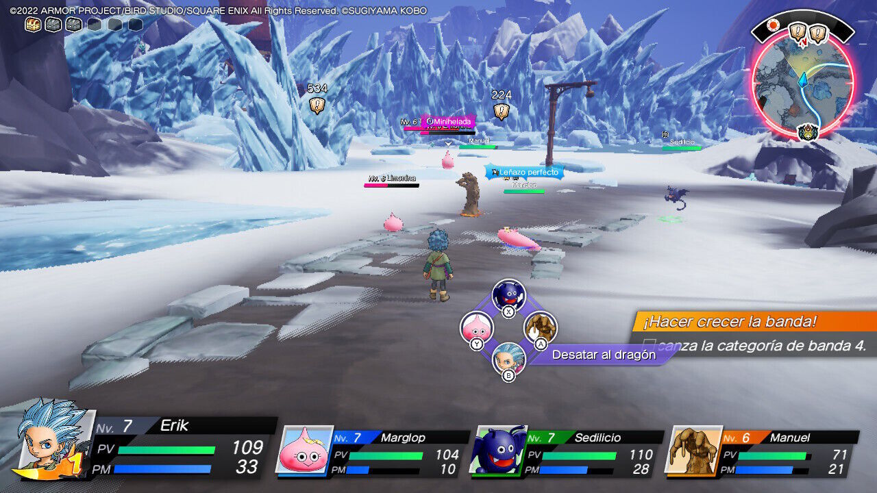 Interesa viajar con un limo o algún tipo de murciélago para desplazarse por el mapa, y estos compañeros participarán en las batallas que iremos encontrando a lo largo del camino. Dragon Quest Treasures se comporta como un ARPG clásico, con Erik y Mia participando activamente en el combate, aunque no es el aspecto más pulido de un gameplay basado en pequeños combos, uso de tirachinas con municiones de distintos efectos y movimiento para rodar. Por suerte hay un puñado de características que animan más la acción: los monstruos participan con sus habilidades, distraen a los enemigos y podemos activar algunas de sus técnicas. Podemos dar algunas órdenes para pasar al ataque o la defensa, pero no hay un control directo ni destaca por el aspecto táctico.