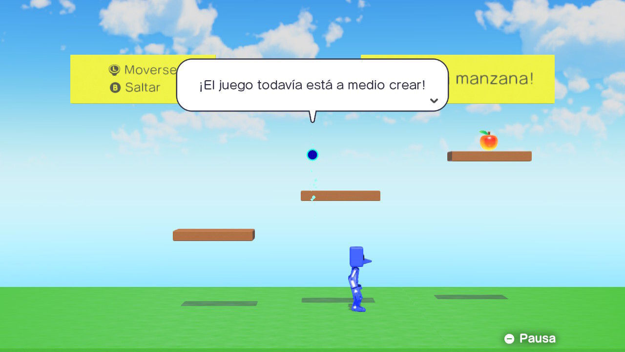 La comparación surgió desde el mismo momento en que Nintendo anunció este título, pero la verdad es que tienen muy poquito que ver, tanto en un sentido positivo como negativo. Estudio de videojuegos no es Dreams. En el programa de Switch se pueden hacer muchísimas cosas, desde plataformas de scroll lateral a juegos de disparos en primera persona, pasando por sudokus y aventuras con puzles y texto, pero de aquí no van a salir cosas espectaculares a nivel técnico como en el videojuego de Media Molecule, ya que no hay una herramienta de modelado (sí de aplicar texturas pixeladas dibujadas). También parece que el gamefeel no se puede retocar tanto como en el juego de PS4, pero quizá cuando empiecen a surgir juegos de otros usuarios por la red no sea así y se deba a que, simplemente, seamos torpes.