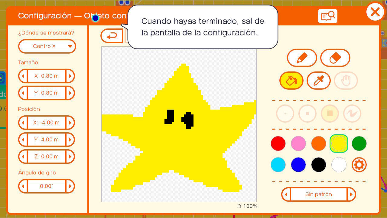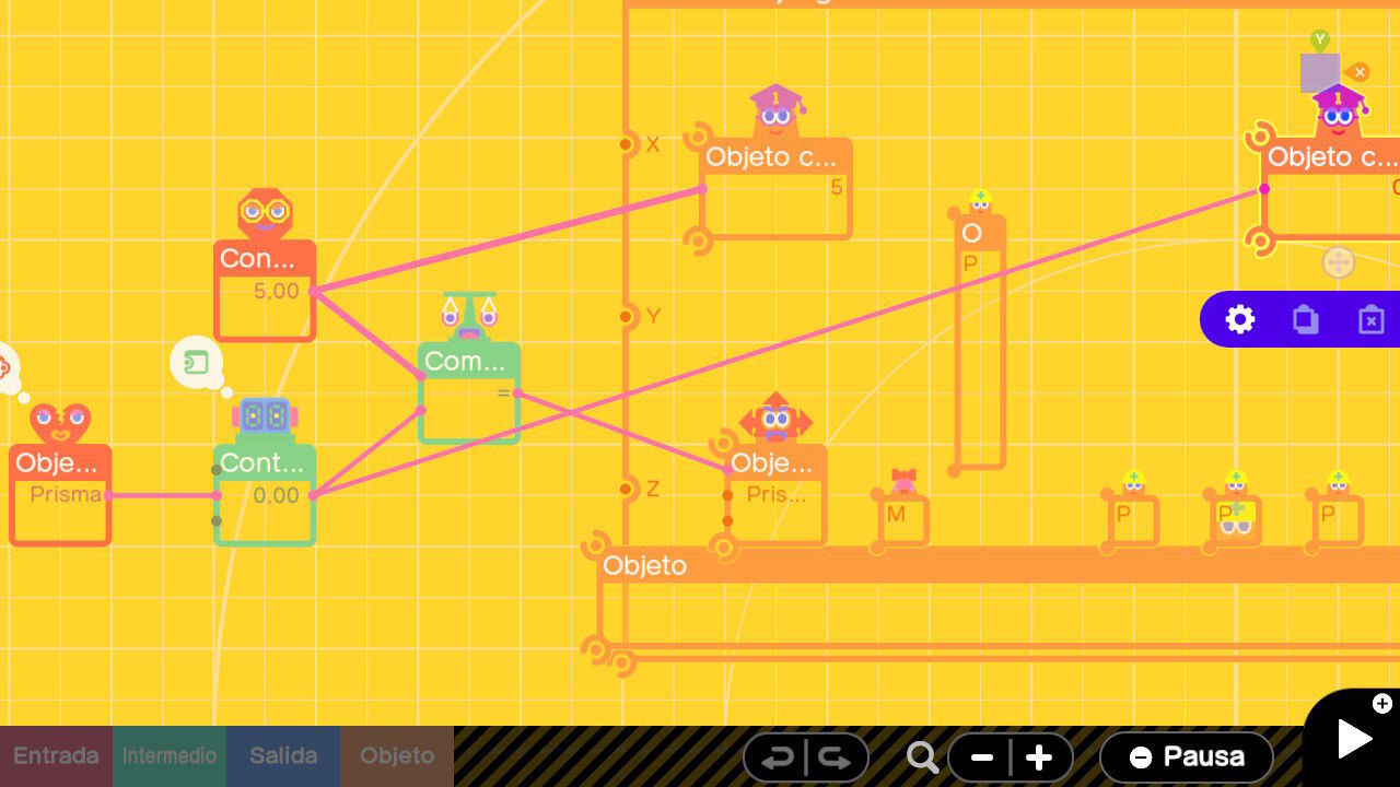 En definitiva, son un montón y llenaríamos varias páginas tan solo enumerándolos. Pero tan importante como su cantidad es su funcionamiento, que es lo que consigue que el programa, dentro de su complejidad, sea muy accesible. Es, en cierto modo, una evolución de la básica herramienta de programación de Nintendo Labo, la mezcla de videojuego y juguete (¿jueguete?) de cartón que dejaba programar las distintas funciones de los Joy-Con. Cada Nodon tiene distintos puertos de entrada. Se entiende muy fácil con el Nodon de Persona: tiene entradas para tres movimientos (arriba y abajo, izquierda y derecha, adelante y atrás) y una acción (a configurar, como salto o puñetazo). Podemos usar un Nodon de entrada a cada uno de ellos, que bien puede ser la palanca, un botón, los controles por movimiento o una constante. Pero además, tiene un puerto de conexión, de modo que, por ejemplo, podemos hacer un Nodon de Objeto de textura en el que hayamos dibujado un gato feo, conectarlo al de Persona y hacer invisible a este último, de modo que controlamos (tras ciertos ajustes) al gato feo.