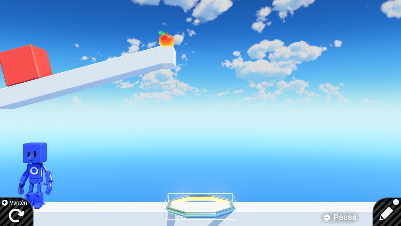 Y eso es lo que queríamos decir con este texto. Que quizá la programación no os interese mucho, que preferís jugar a juegos que hacerlos, o que puede ser que os agobie el propio concepto de Estudio de videojuegos; pero si os gustan los puzles, el título se puede abordar de esa misma manera. Hay una cuarta capa de aprendizaje, la más importante, que no hemos comentado antes: los rompecabezas que aparecen entre lección y lección. En ellos se nos plantean situaciones que se resuelven en unos pocos segundos: un Nodo de Persona tiene que coger una manzana. Pero quizá el personaje no se puede controlar o una plataforma se rompe al pasar por ella. Hay que acceder a la malla, estudiar cómo está hecho el juego, y modificarlo de modo que se pueda cumplir el objetivo. La malla, en la que la mayoría de los Nodon están bloqueados y solo podemos cambiar algunos ajustes o modificar las conexiones, se convierte en un puzle que solo podemos resolver aplicando lo aprendido en las lecciones anteriores. No solo es divertido e ingenioso, sino que es la parte más importante del aprendizaje: la puesta en práctica.